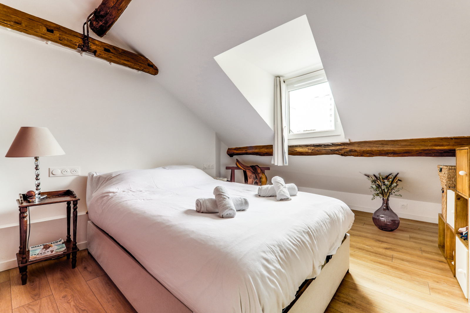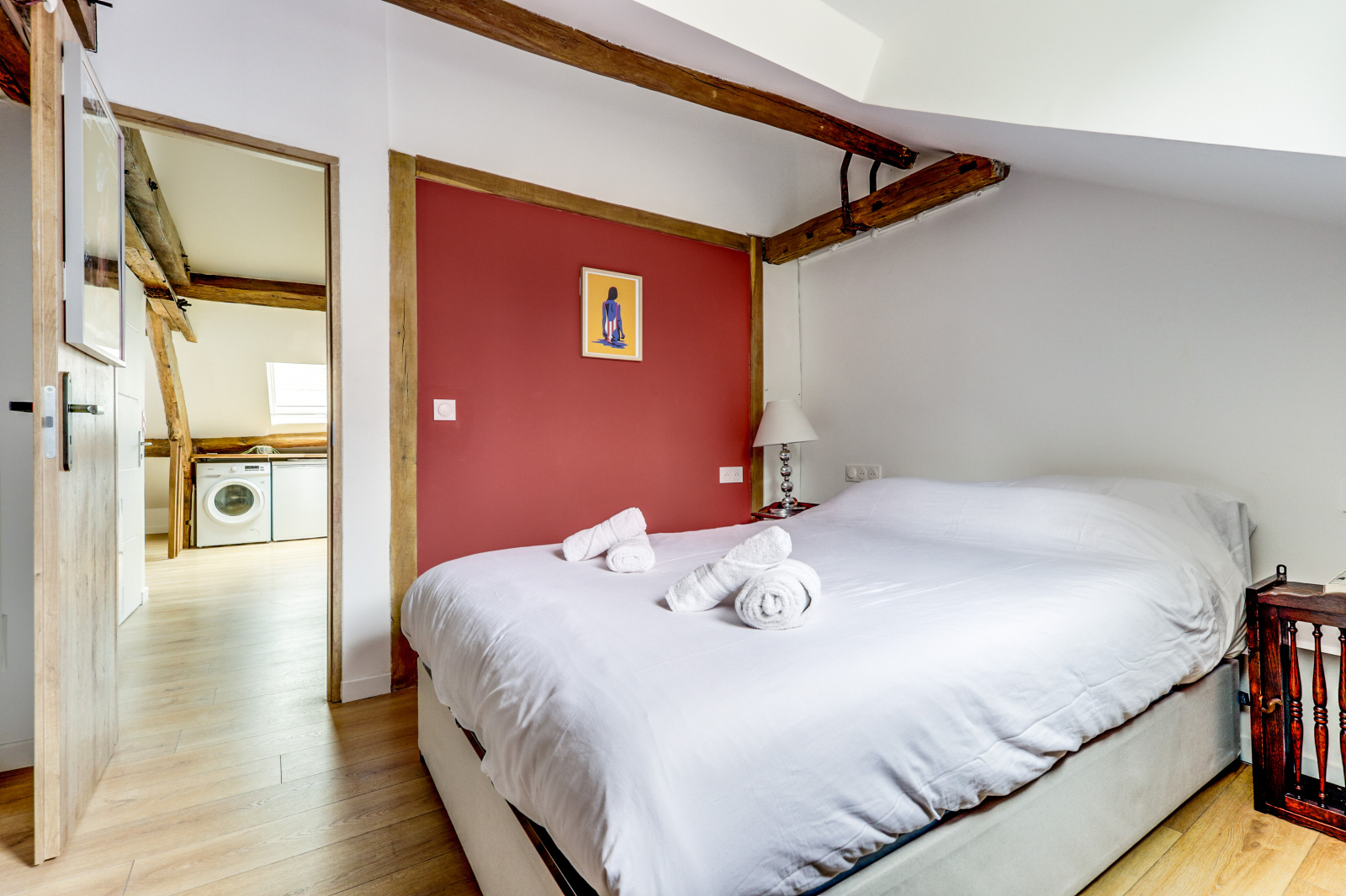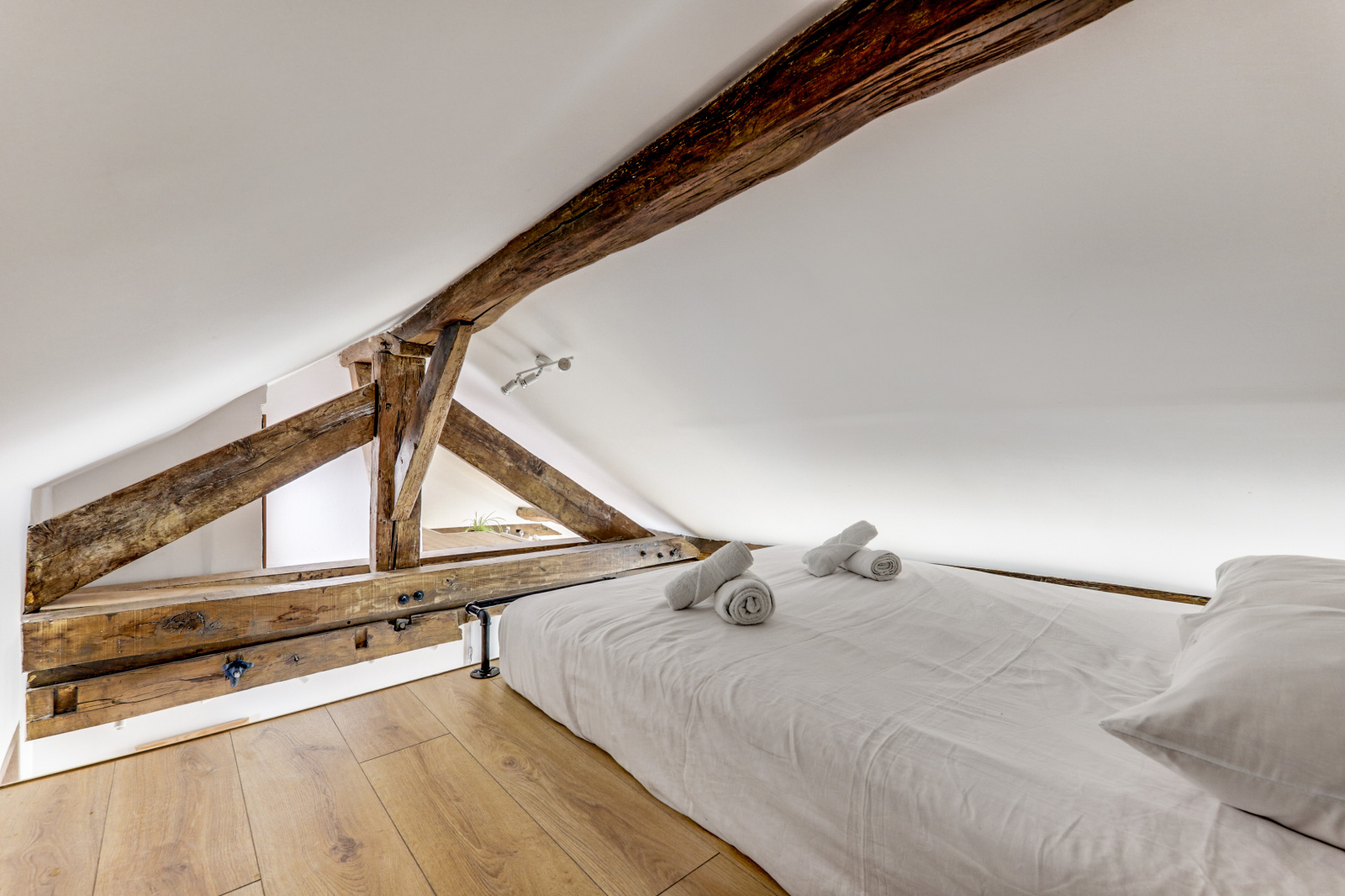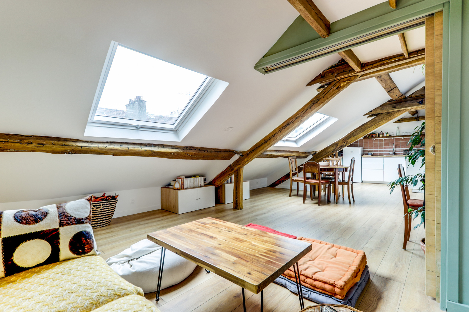 L'appartement se distingue par ses poutres apparentes, son parquet chaleureux et son plafond mansardé, qui ajoutent une touche unique et accueillante à l'espace. Il dispose d'une chambre principale avec un lit double, ainsi que d'une mezzanine avec un deuxième lit double, parfait pour accueillir des amis ou de la famille. Profitez également d'une salle de douche rénovée et moderne, et d'une cuisine équipée ouverte sur un séjour charmant.