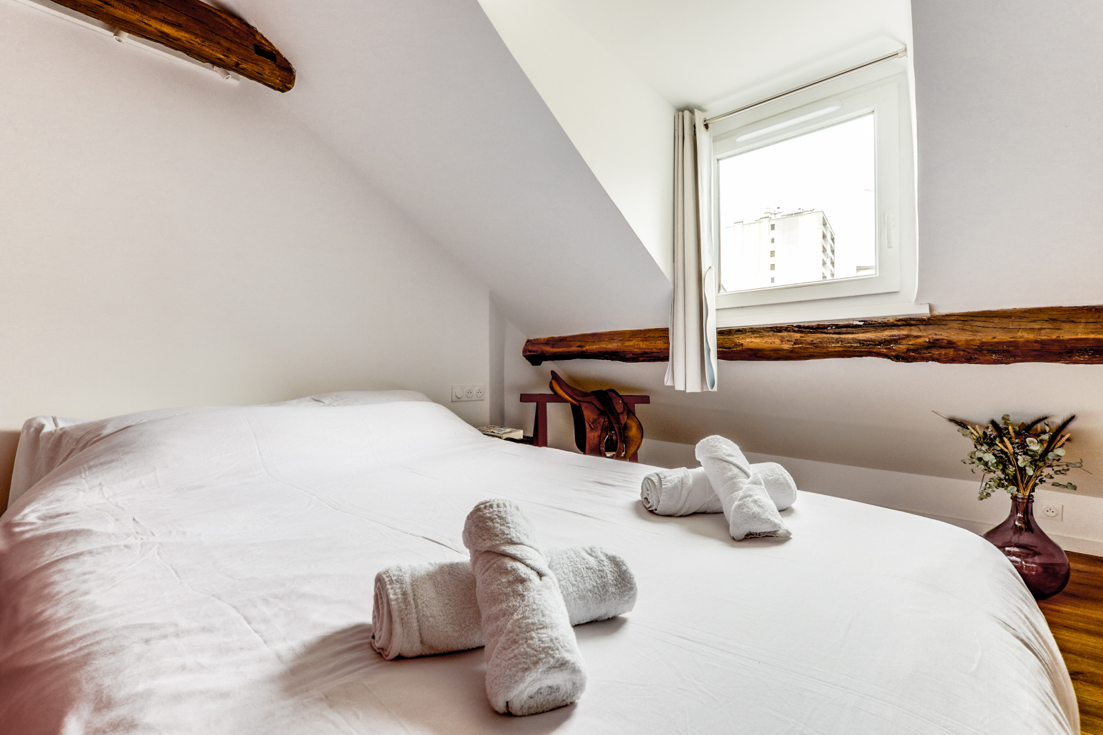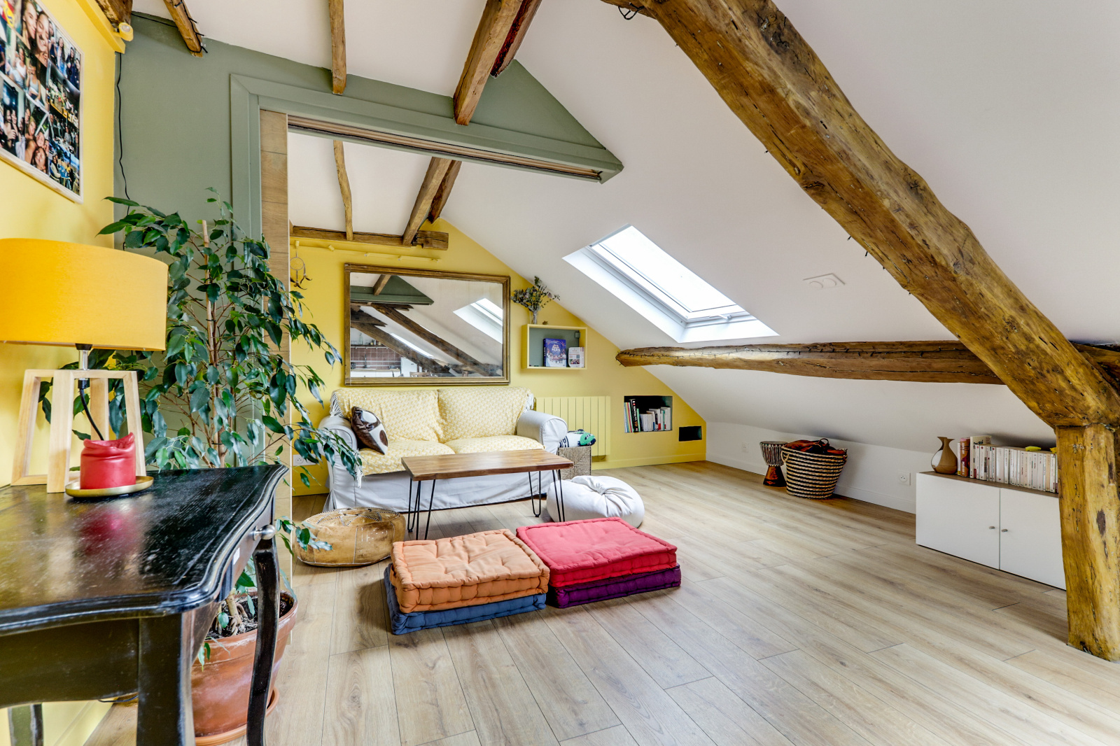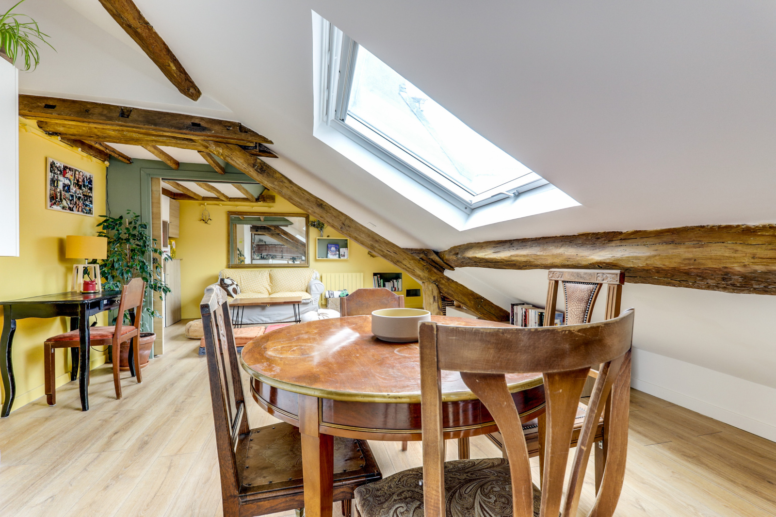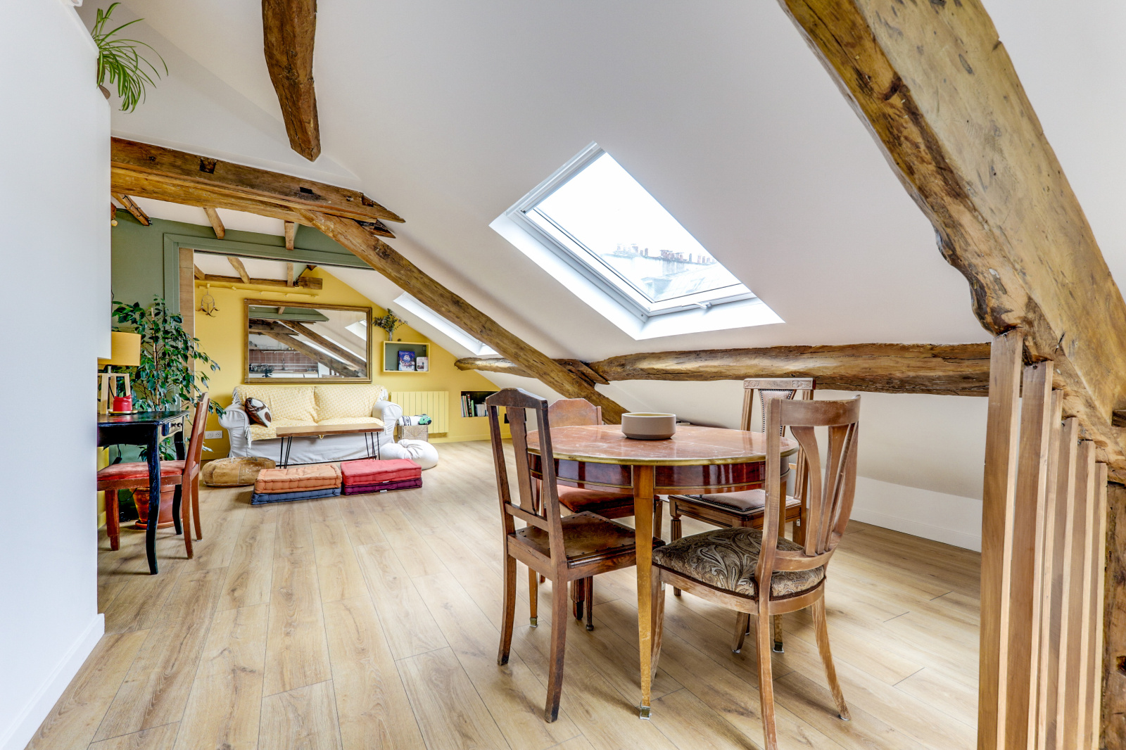 L'appartement se distingue par ses poutres apparentes, son parquet chaleureux et son plafond mansardé, qui ajoutent une touche unique et accueillante à l'espace. Il dispose d'une chambre principale avec un lit double, ainsi que d'une mezzanine avec un deuxième lit double, parfait pour accueillir des amis ou de la famille. Profitez également d'une salle de douche rénovée et moderne, et d'une cuisine équipée ouverte sur un séjour charmant.