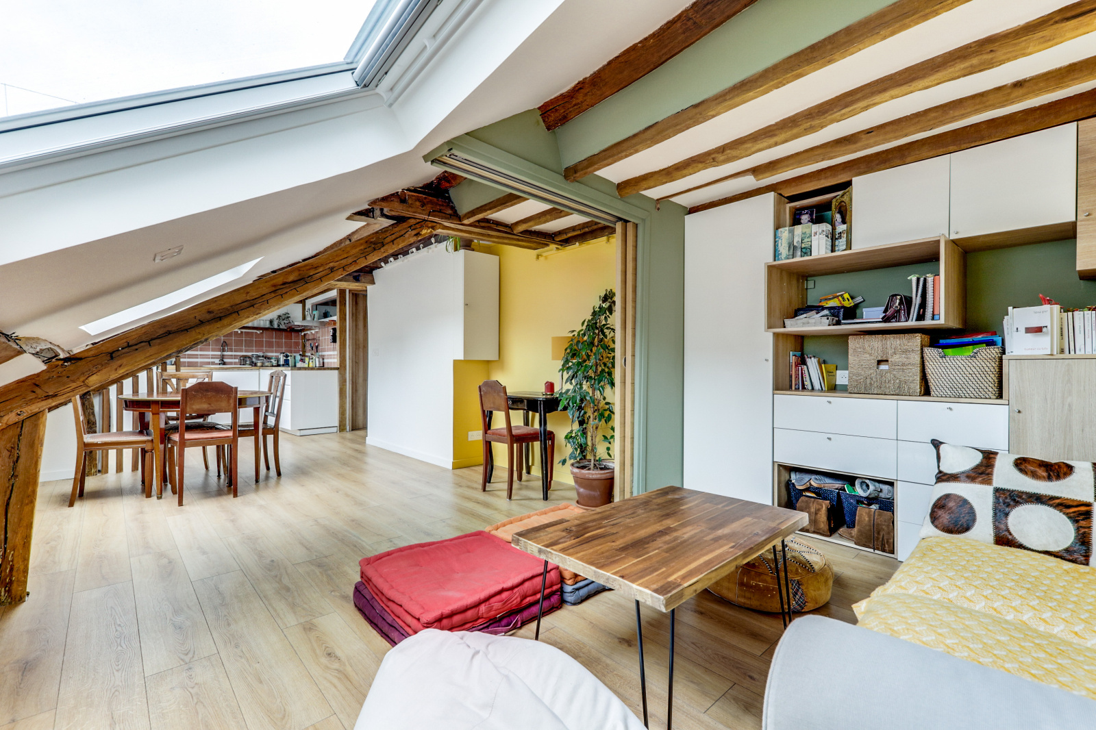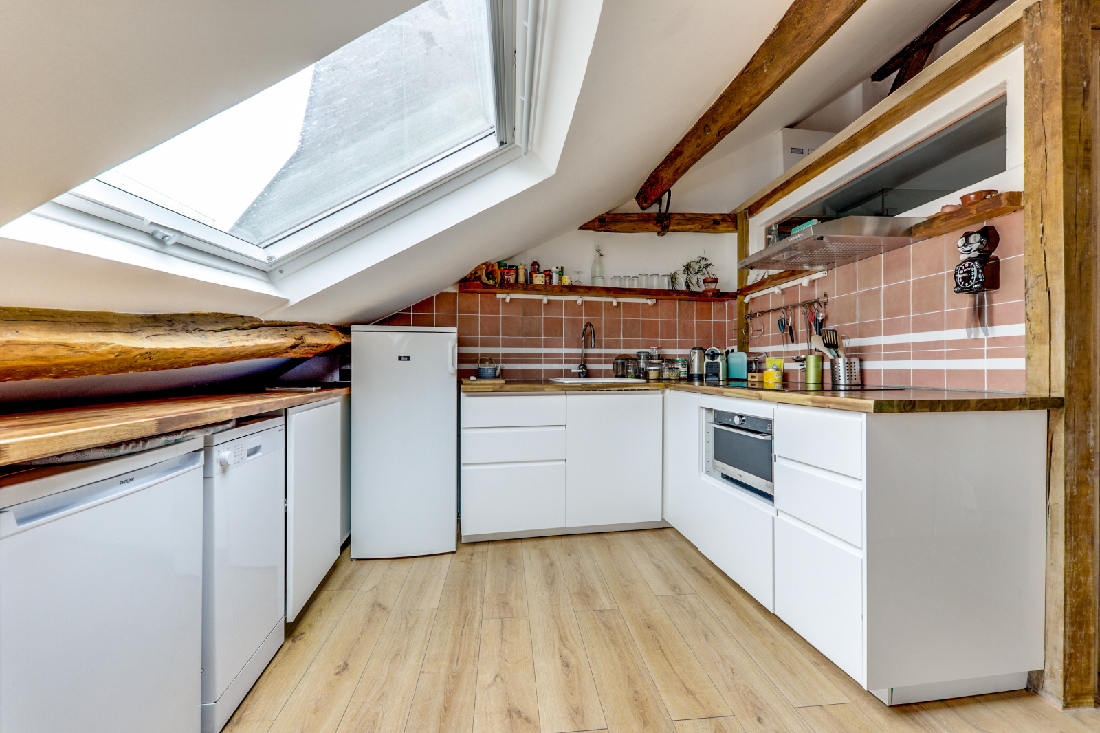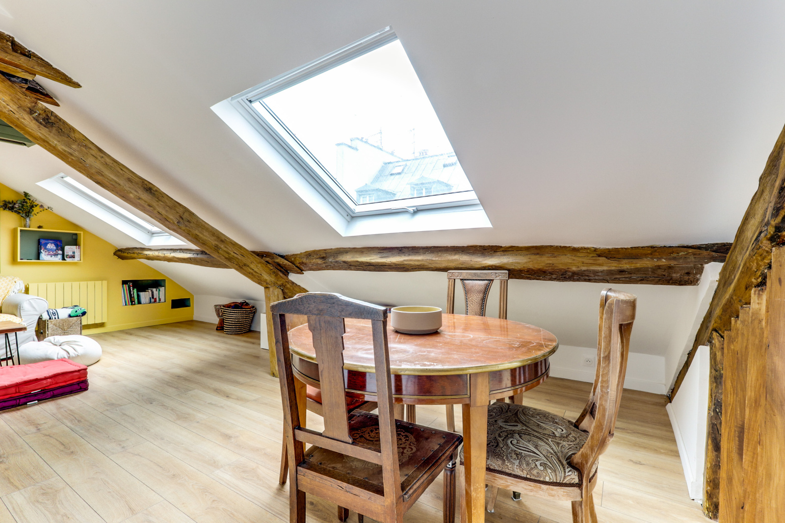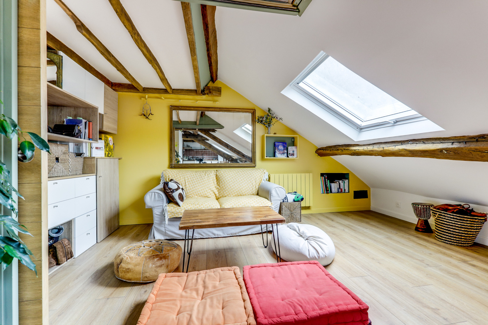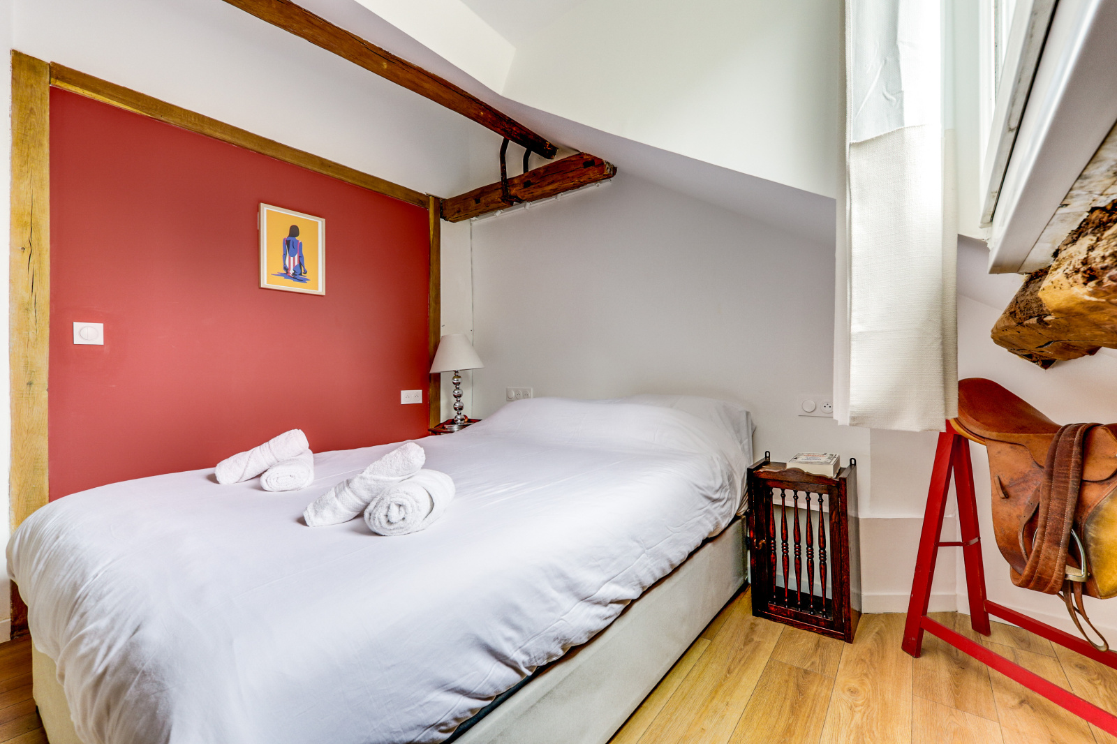 L'appartement se distingue par ses poutres apparentes, son parquet chaleureux et son plafond mansardé, qui ajoutent une touche unique et accueillante à l'espace. Il dispose d'une chambre principale avec un lit double, ainsi que d'une mezzanine avec un deuxième lit double, parfait pour accueillir des amis ou de la famille. Profitez également d'une salle de douche rénovée et moderne, et d'une cuisine équipée ouverte sur un séjour charmant.