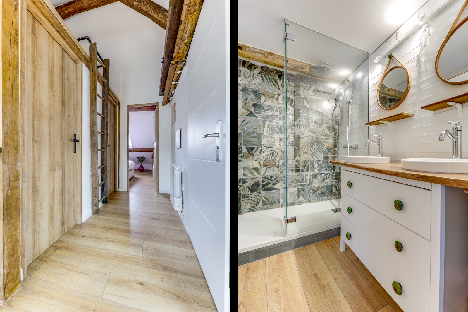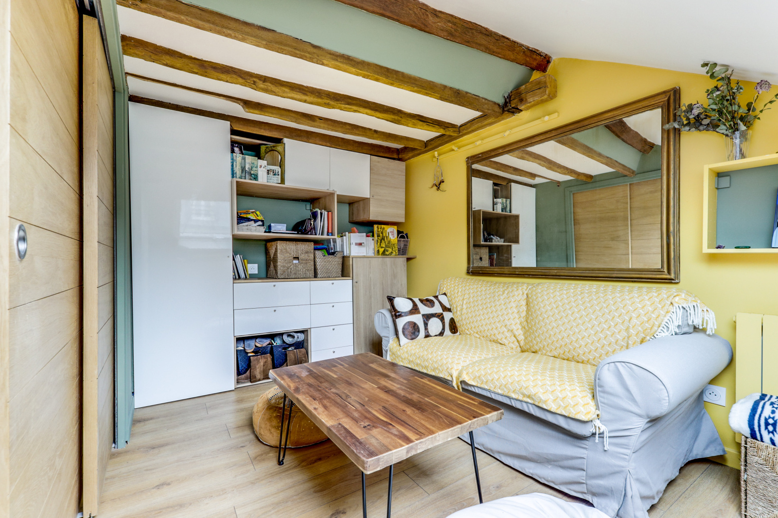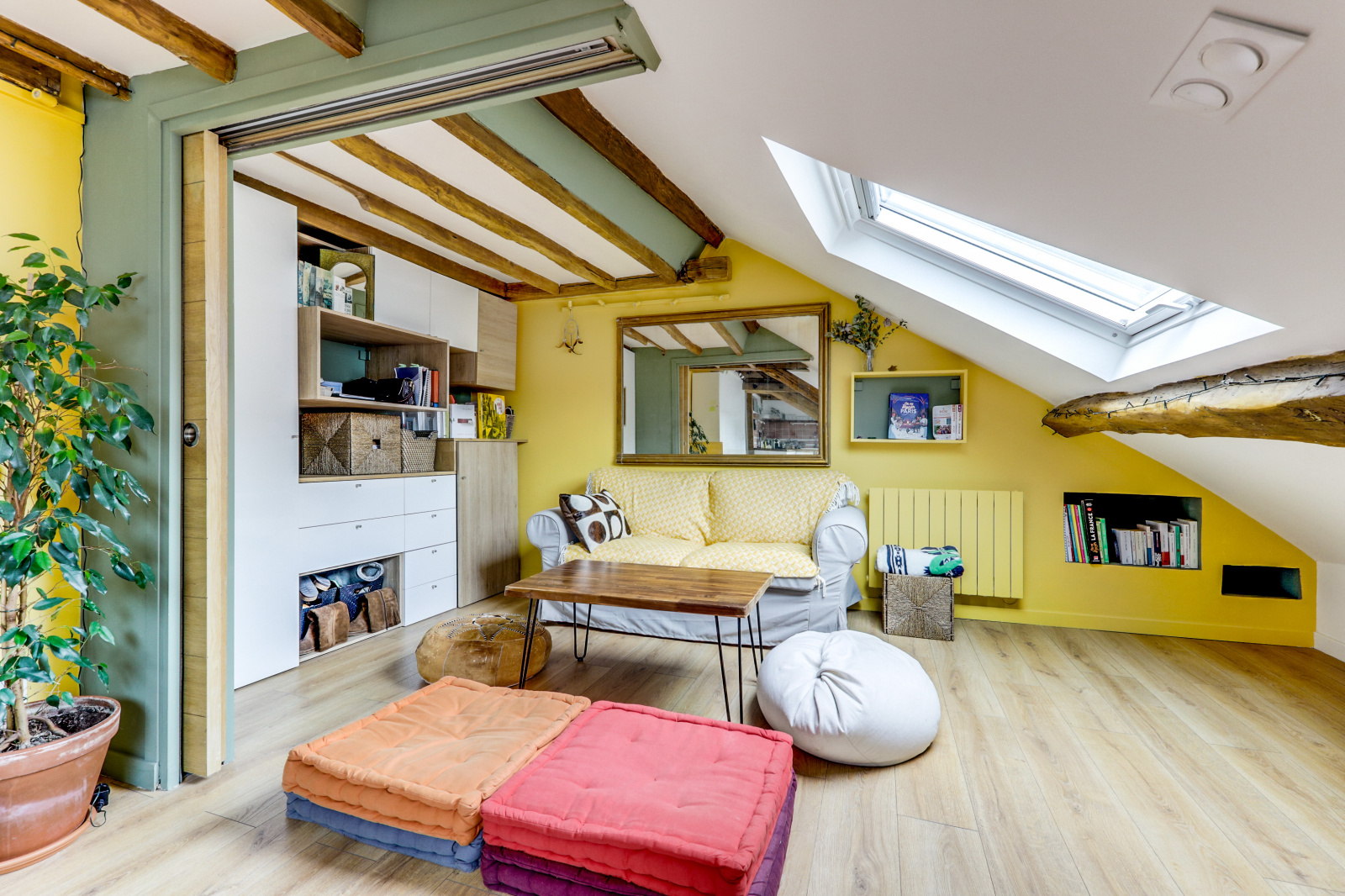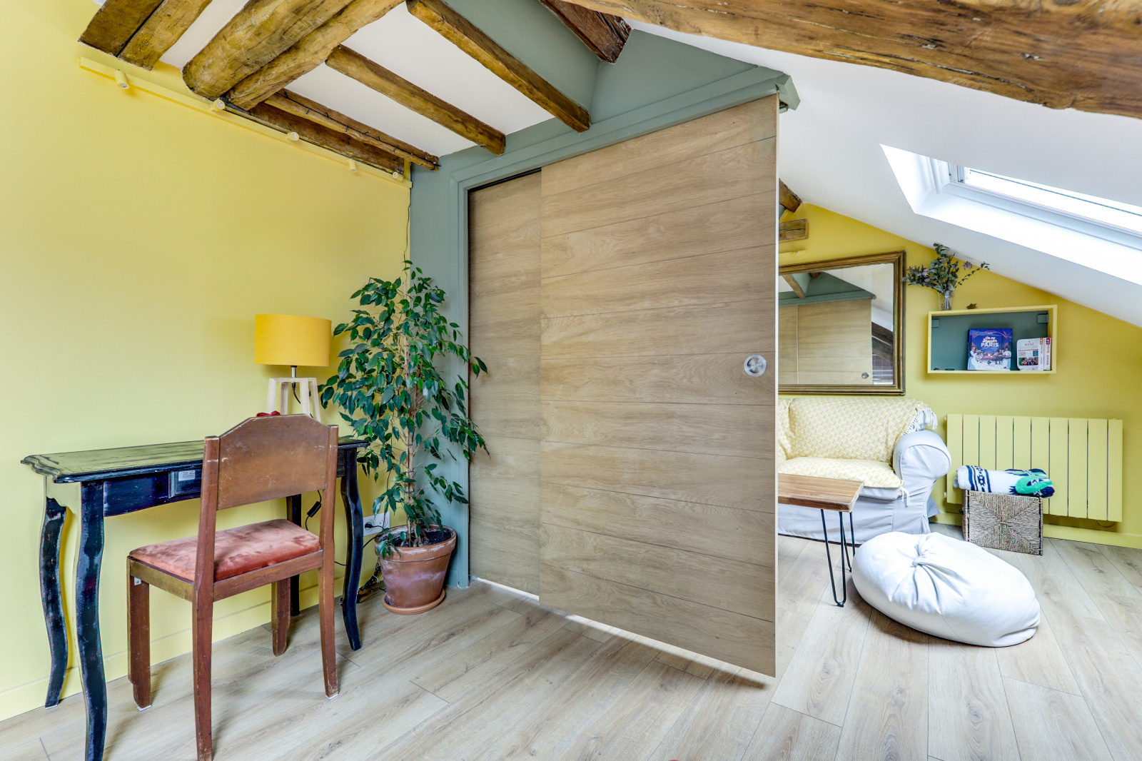 L'appartement se distingue par ses poutres apparentes, son parquet chaleureux et son plafond mansardé, qui ajoutent une touche unique et accueillante à l'espace. Il dispose d'une chambre principale avec un lit double, ainsi que d'une mezzanine avec un deuxième lit double, parfait pour accueillir des amis ou de la famille. Profitez également d'une salle de douche rénovée et moderne, et d'une cuisine équipée ouverte sur un séjour charmant.