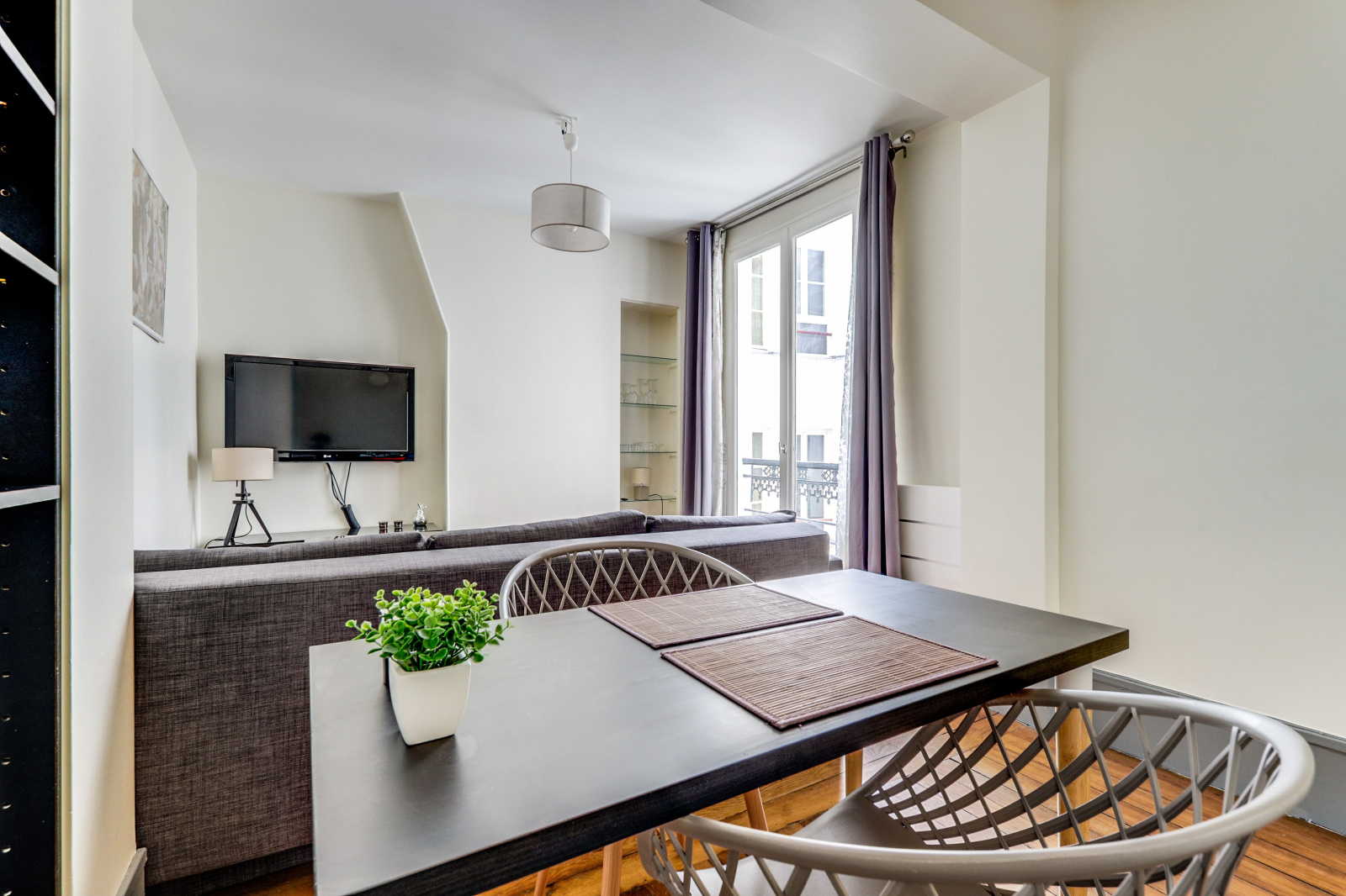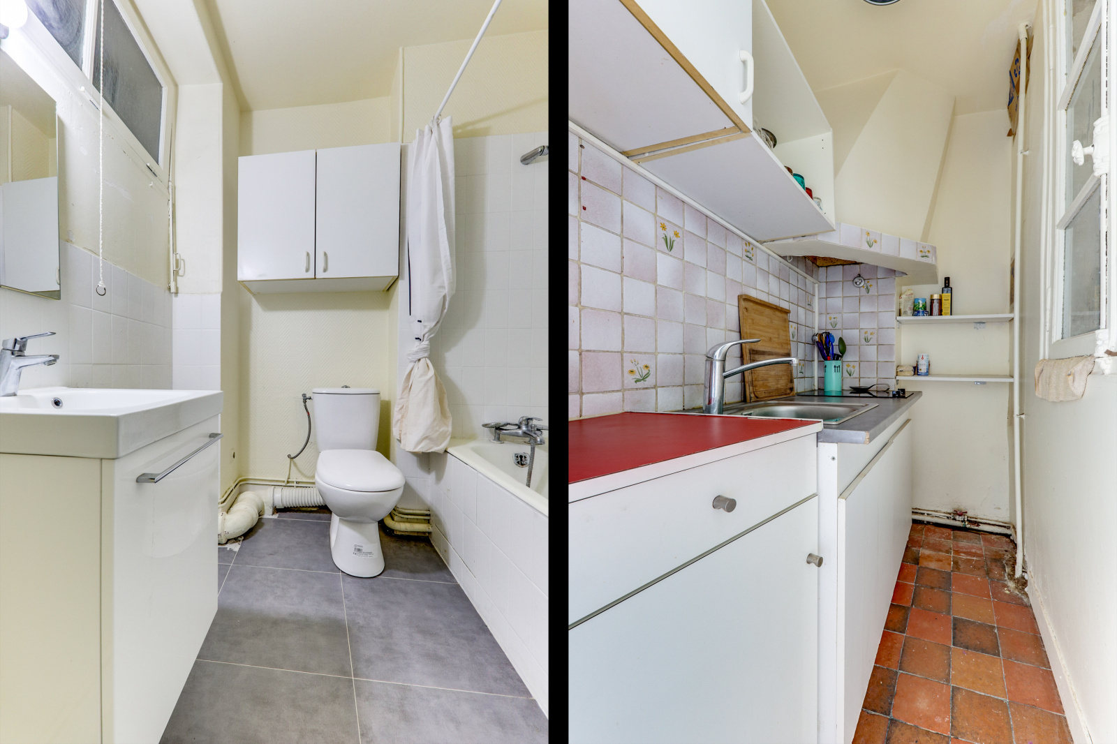 Entrée, grand séjour/salle à manger avec 2 fenêtres, cuisine indépendante, chambre, salle de bains avec wc.