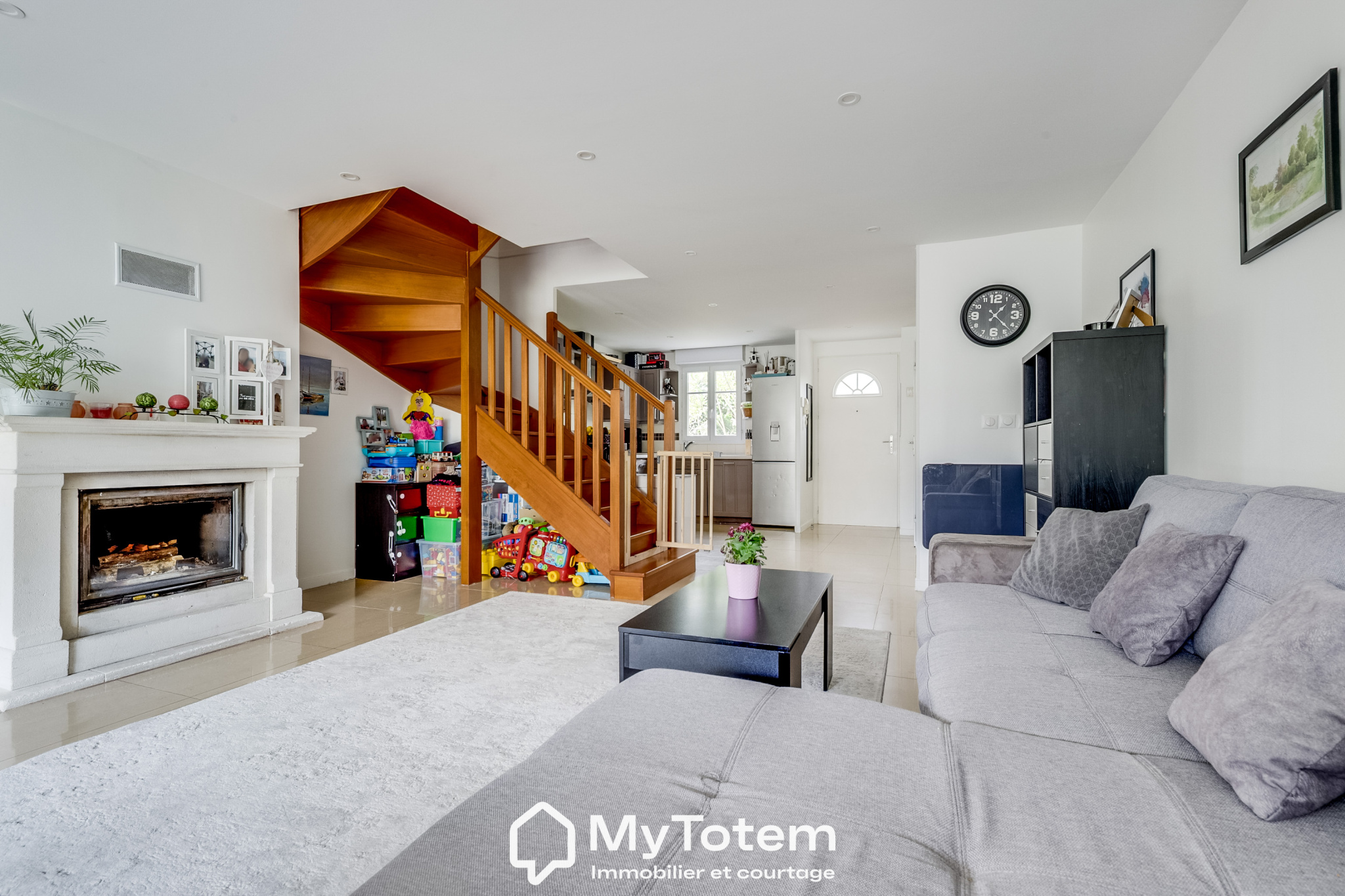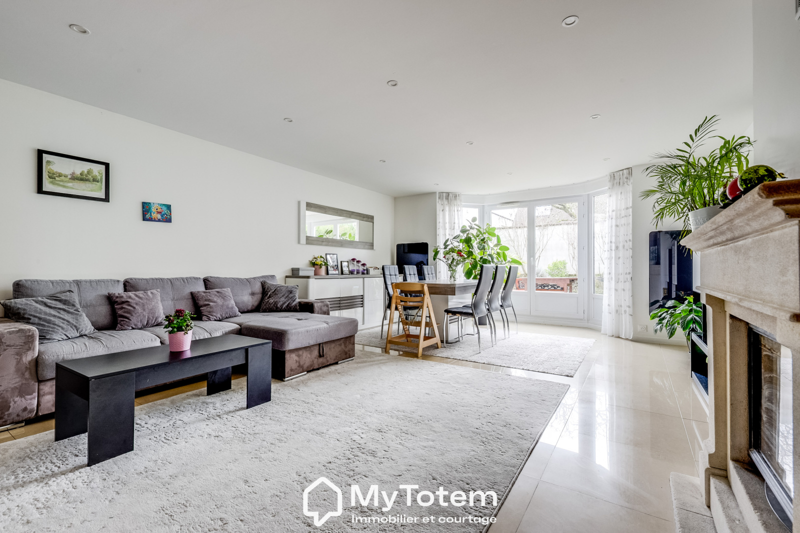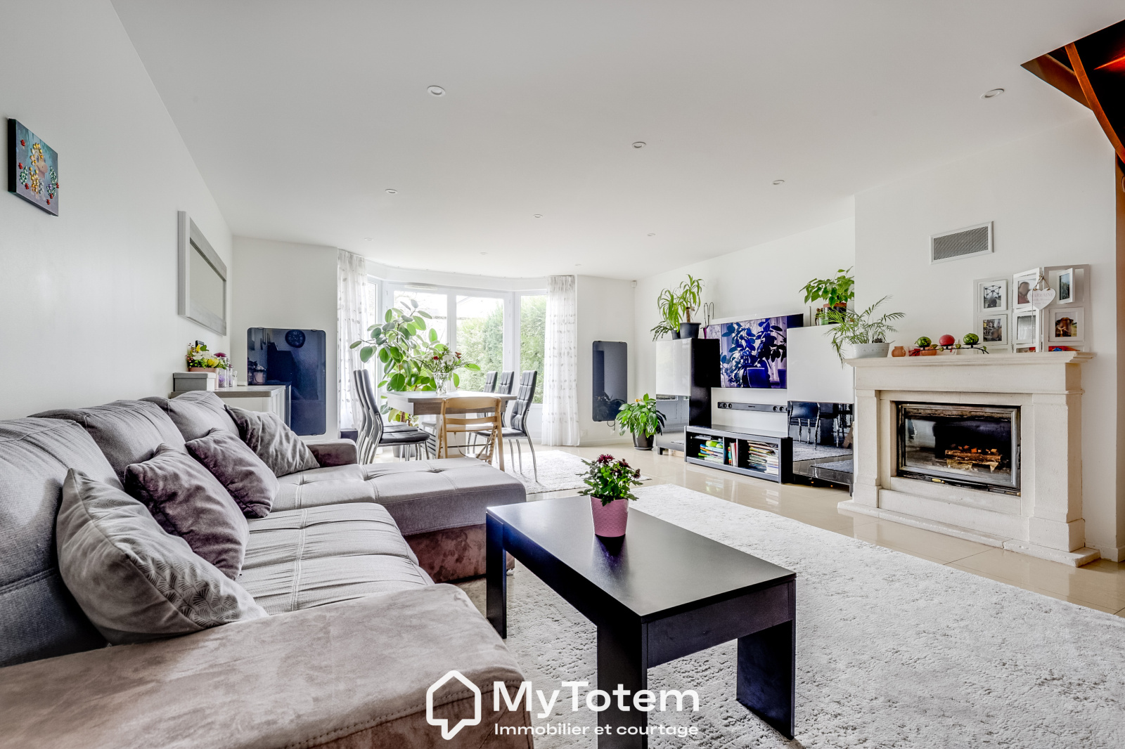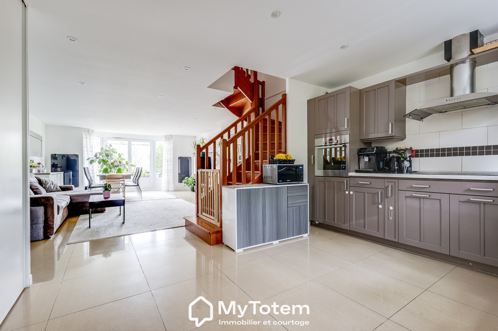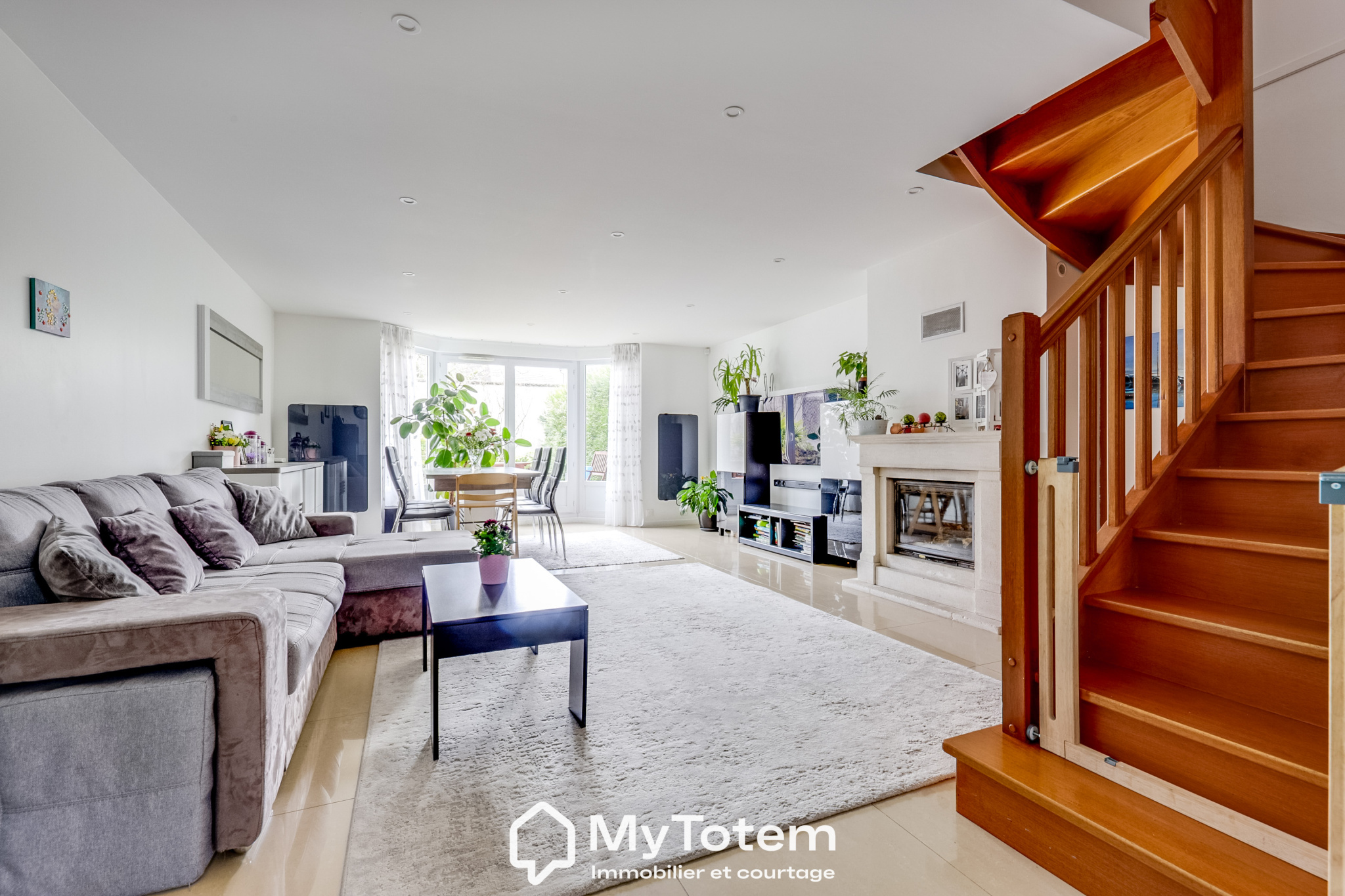 Le niveau principal s’ouvre sur une vaste pièce de vie d’environ 48 m², comprenant une cuisine ouverte aménagée et équipée, un double séjour avec cheminée et un espace salle à manger, le tout donnant directement accès à un jardin paysagé de 115 m², bénéficiant d’une exposition Est et Sud-Est.