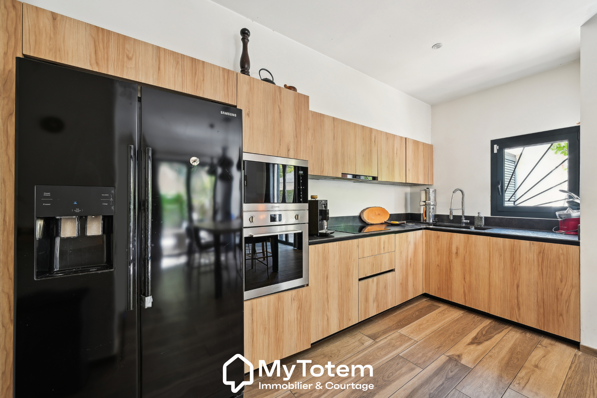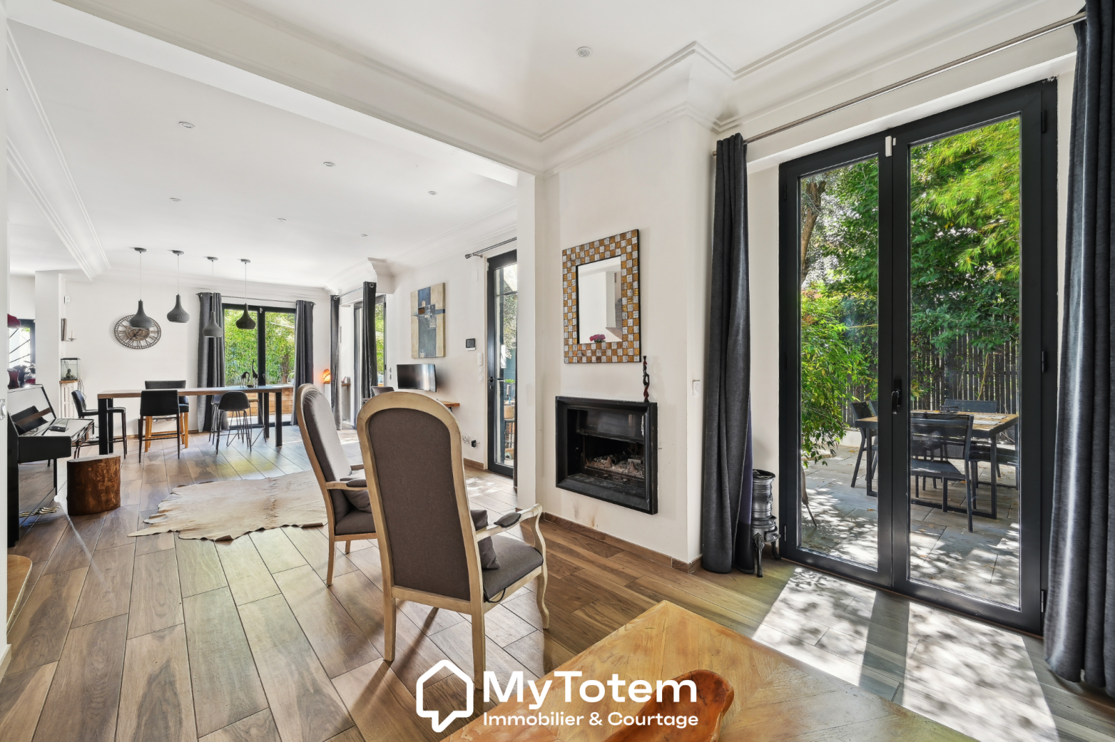 La maison comprend un très bel espace séjour / salle à manger de 60 m² avec cuisine américaine équipée donnant sur terrasse et jardin plein SUD.