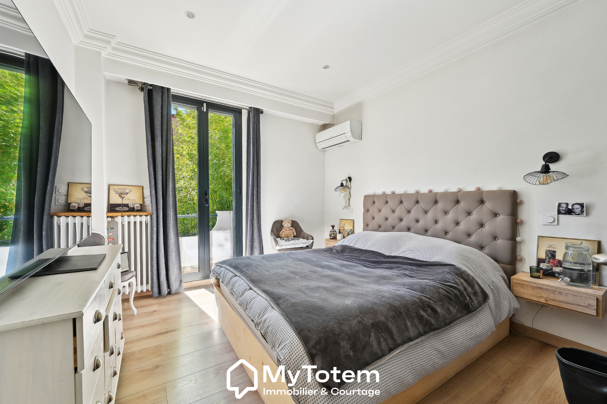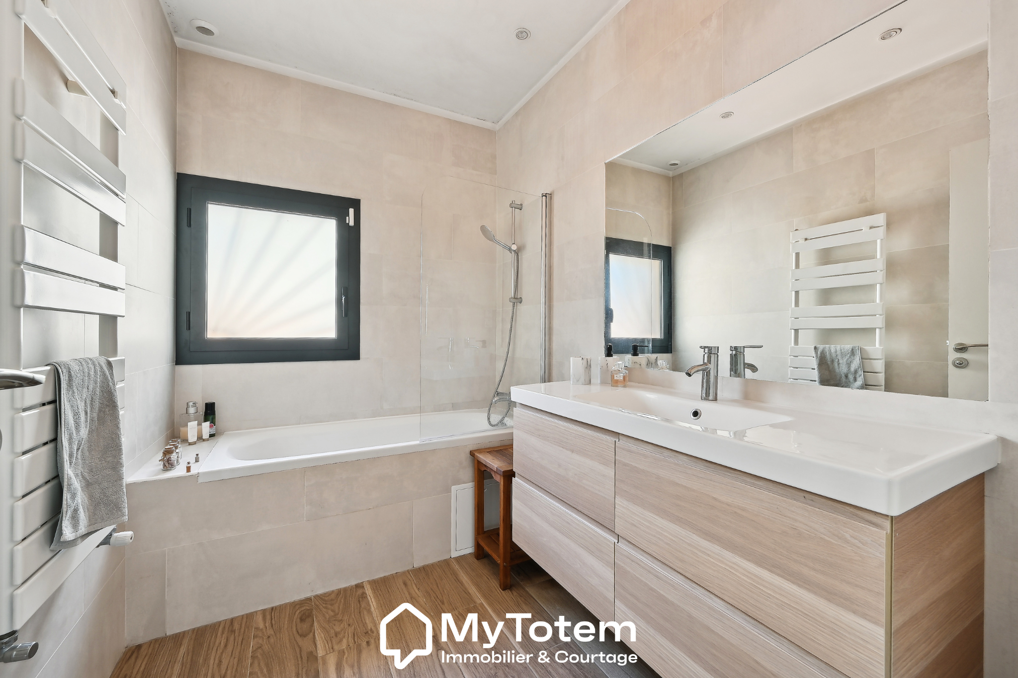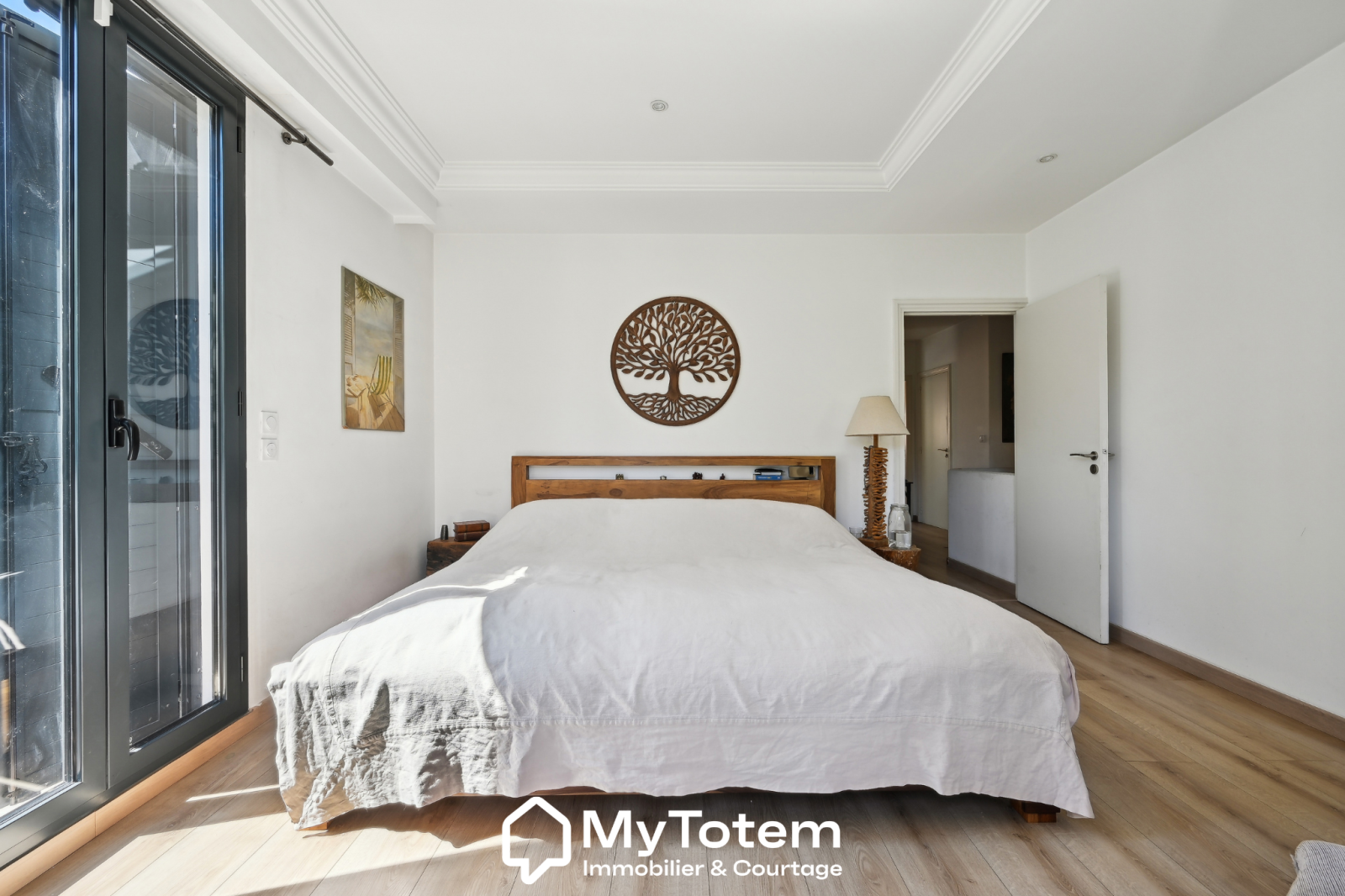 A l'étage, 3 grandes chambres avec 12 m² de balcons, dont une suite parentale,1 salle de bains, 2 salles d'eau, un espace buanderie.