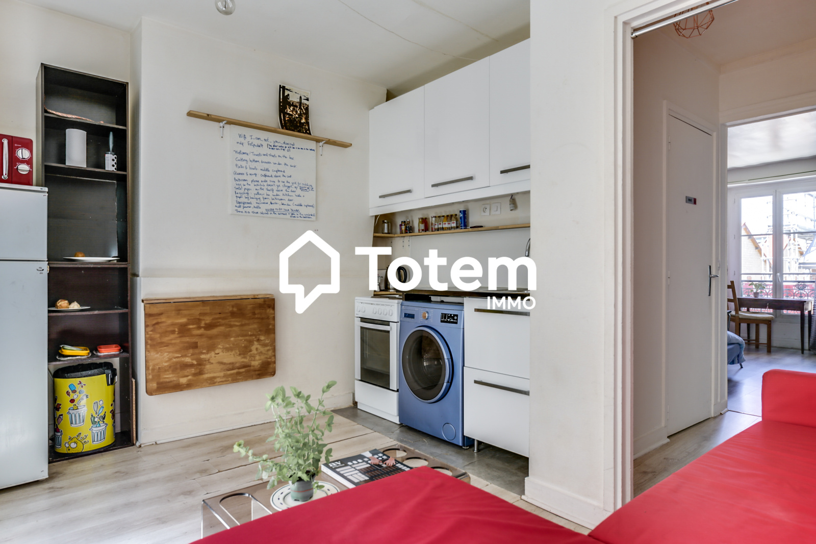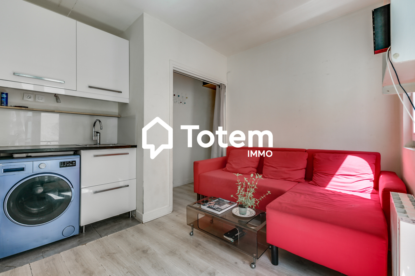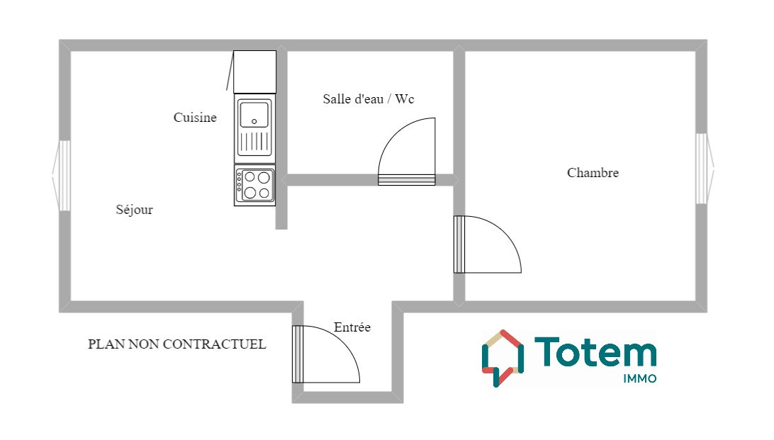 Entrée, séjour avec cuisine américaine, chambre, salle de bains avec wc.