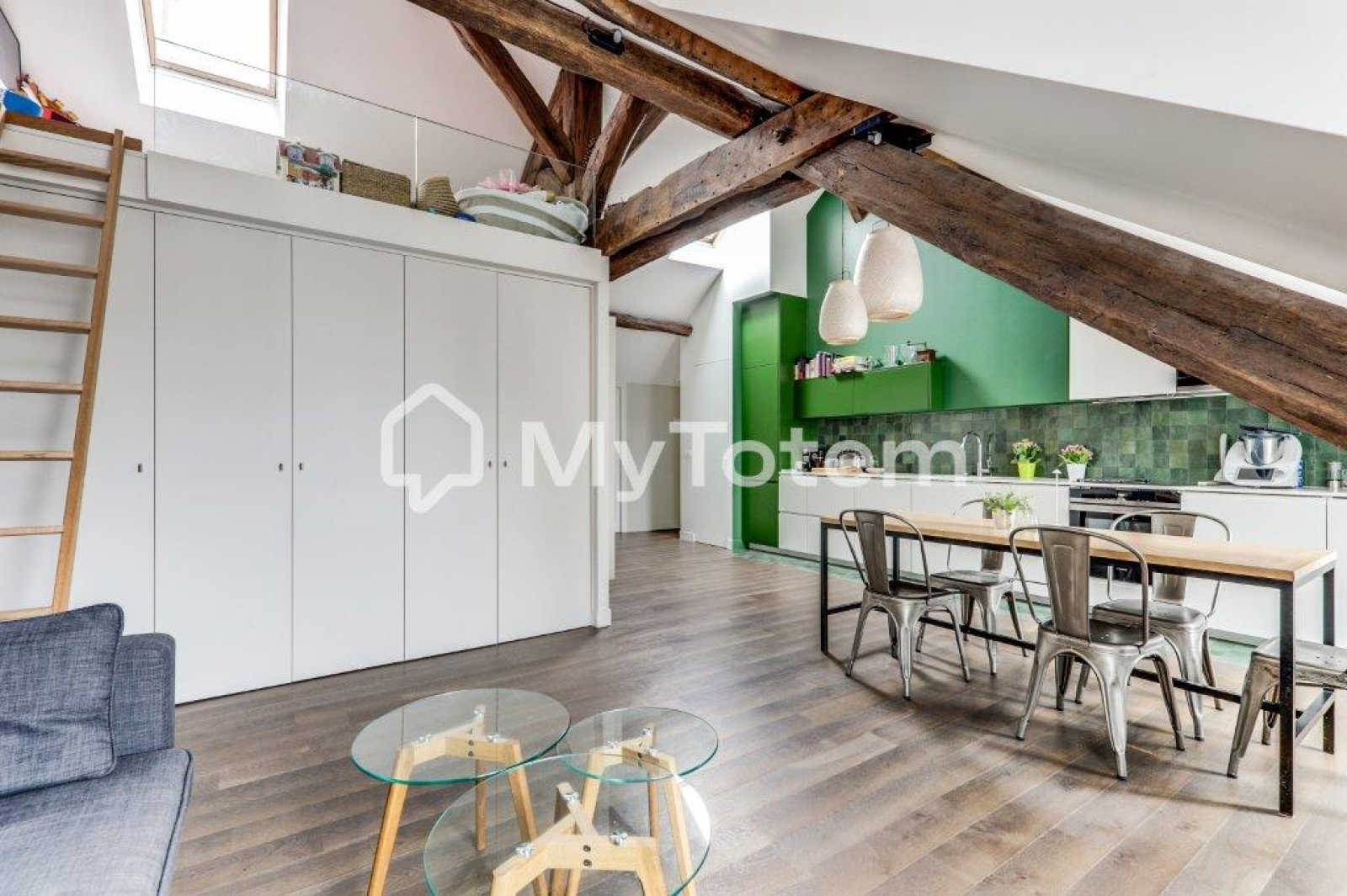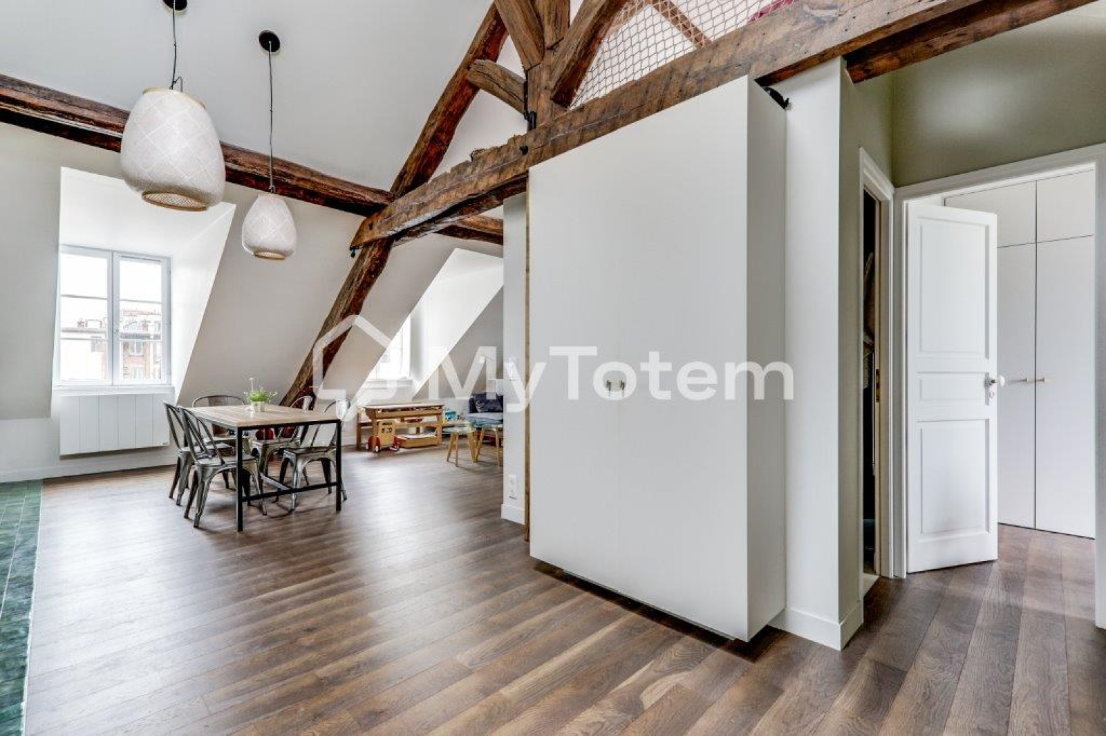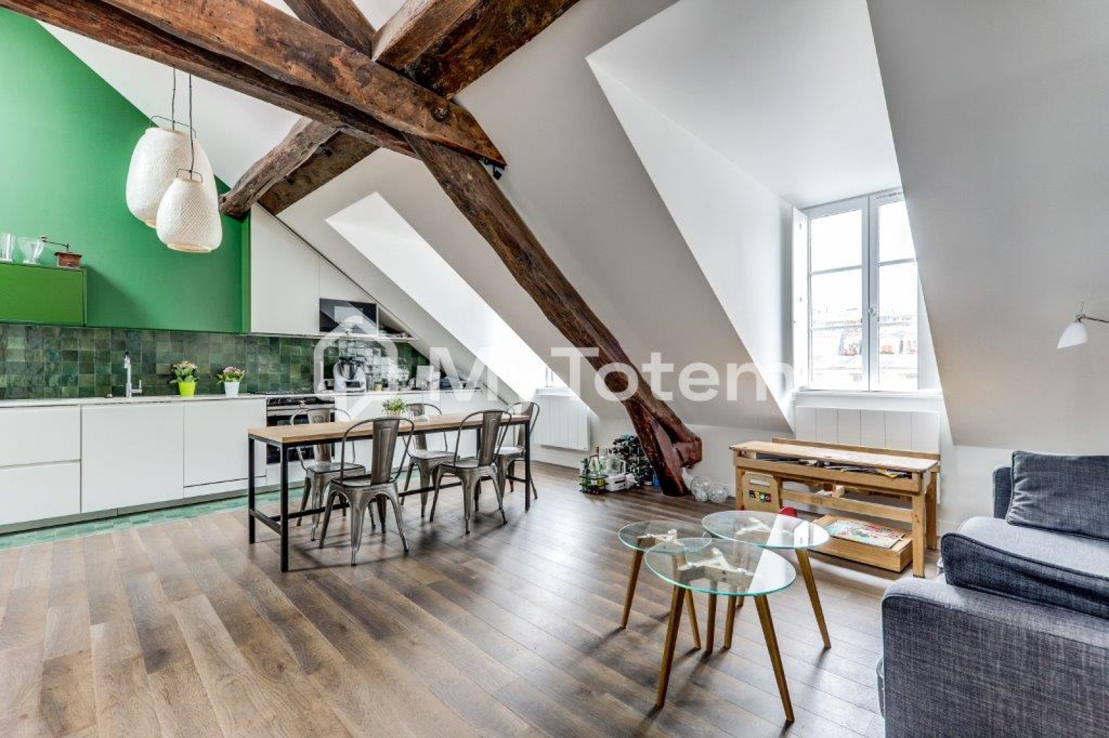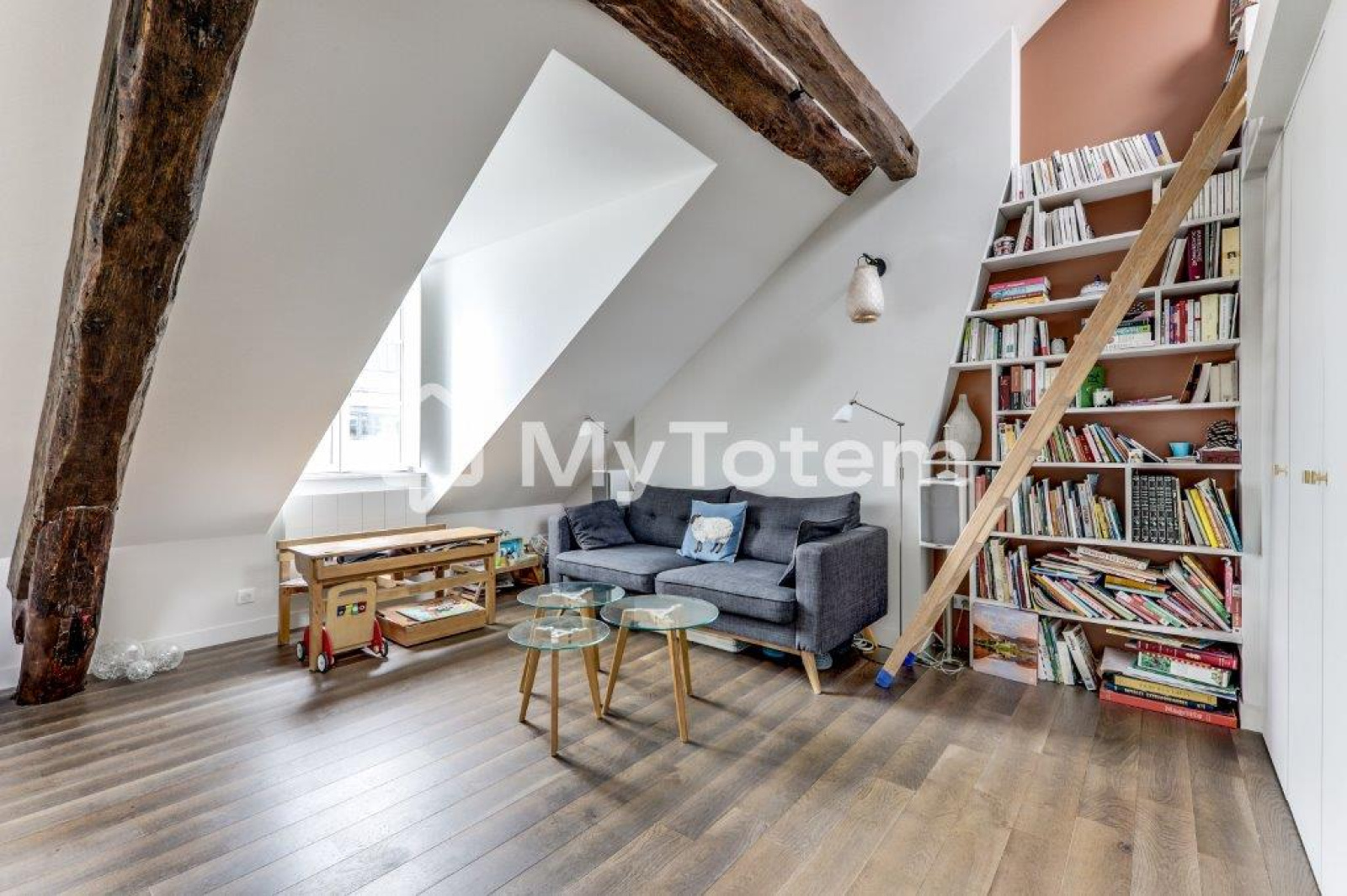 Ce bien a été totalement repensé et réalisé par l'architecte Denise Omer dans un esprit cocon sous les toits de Paris tout en mélangeant praticité au quoitidien.
