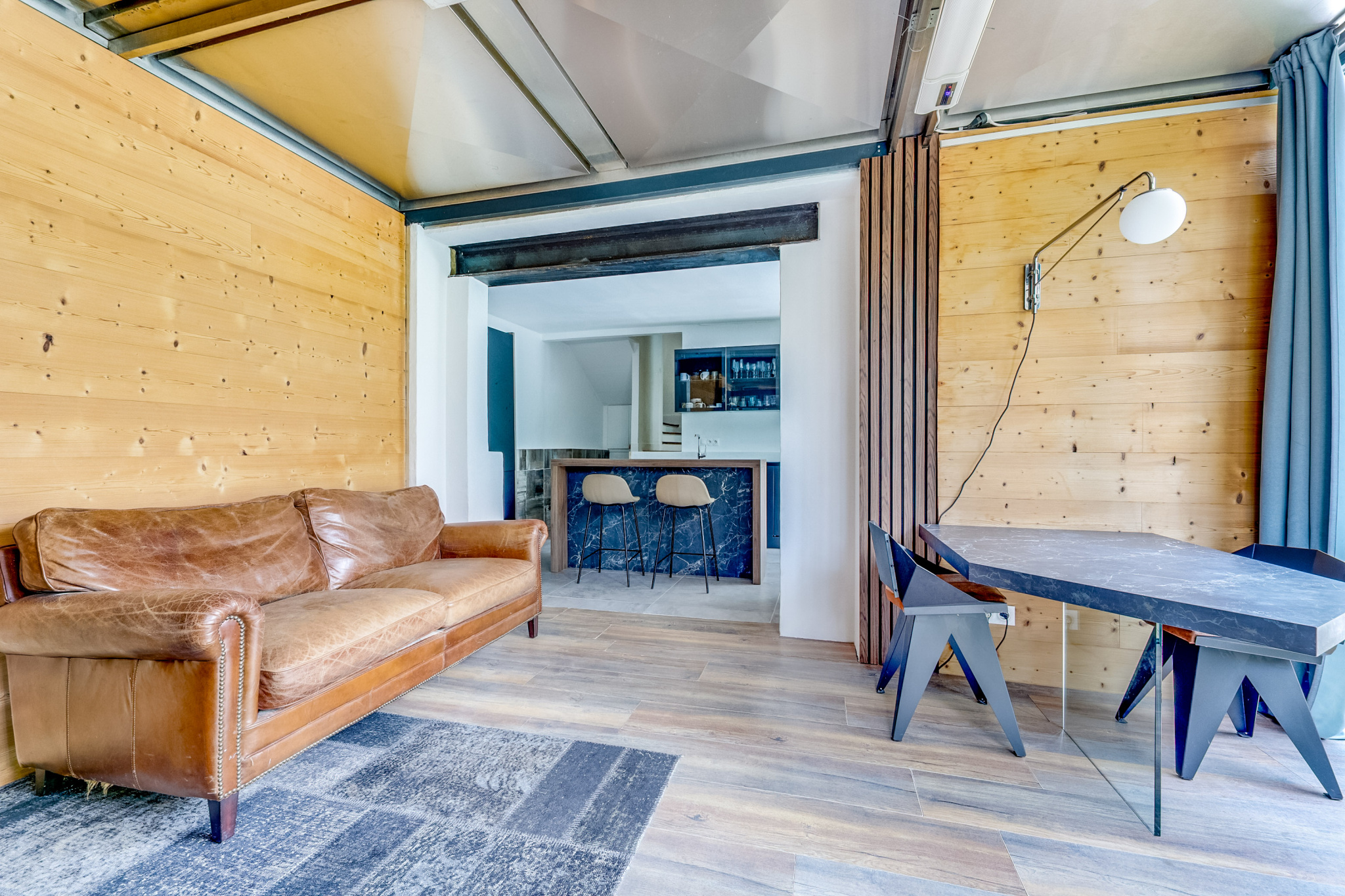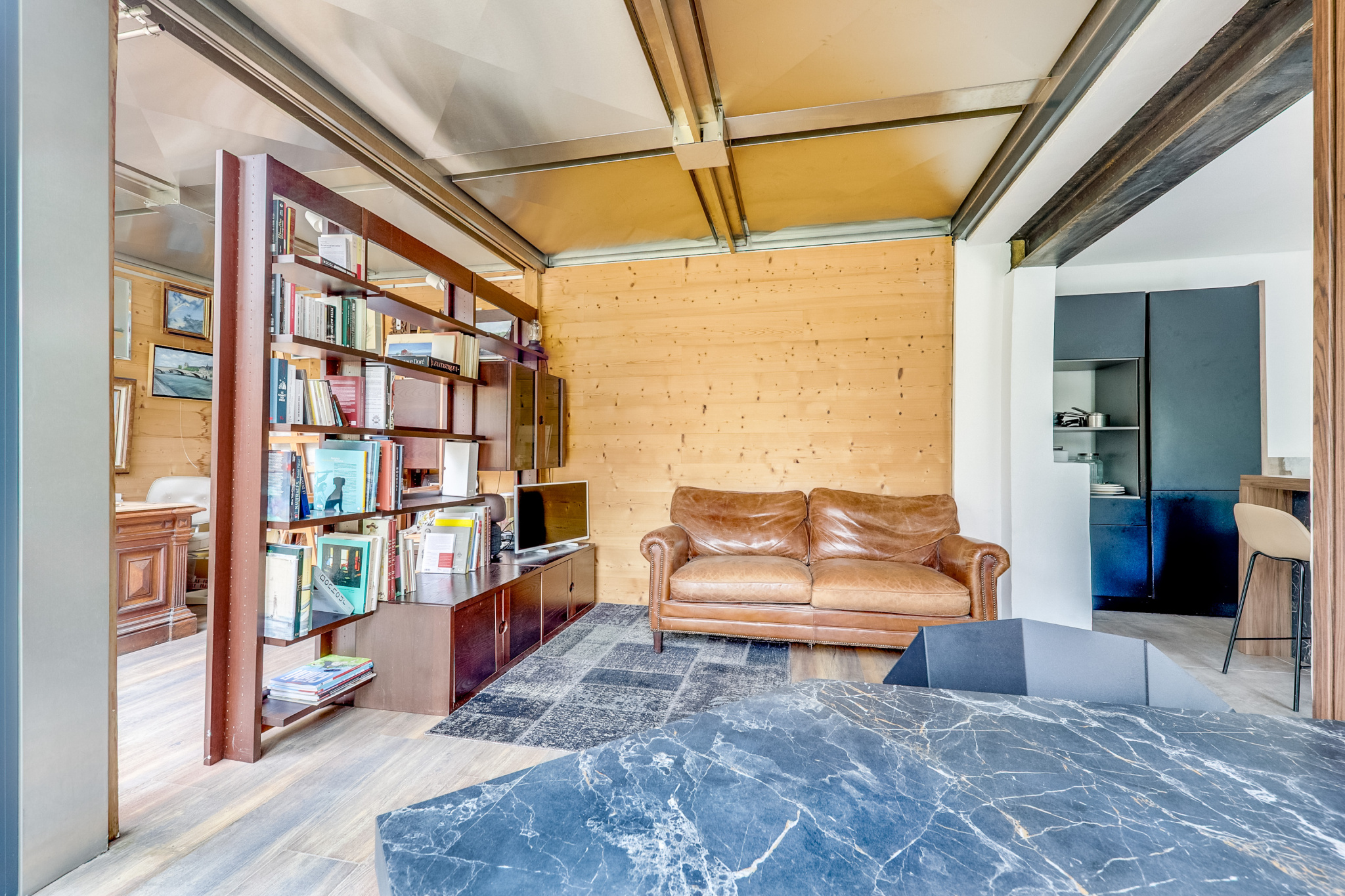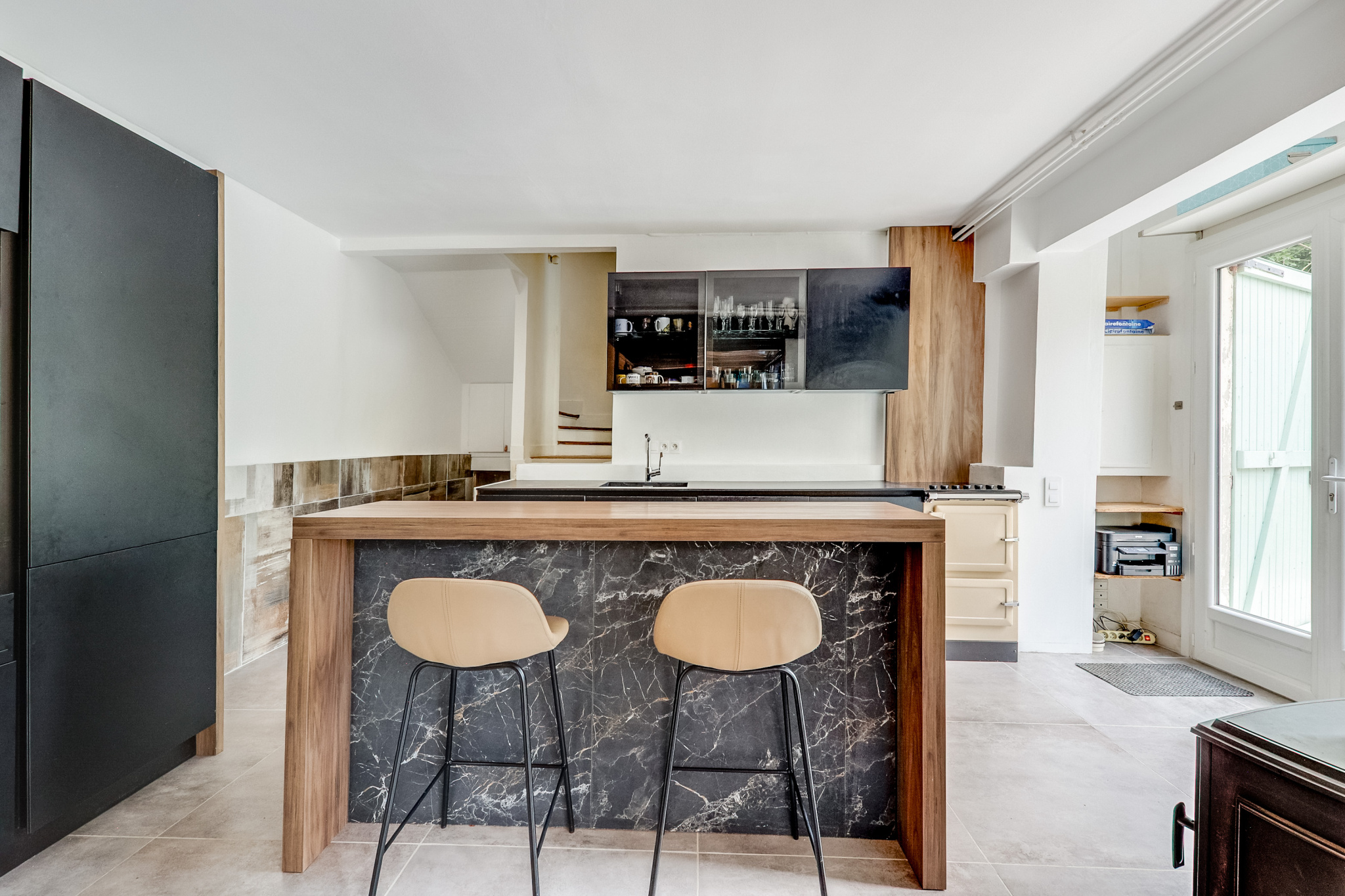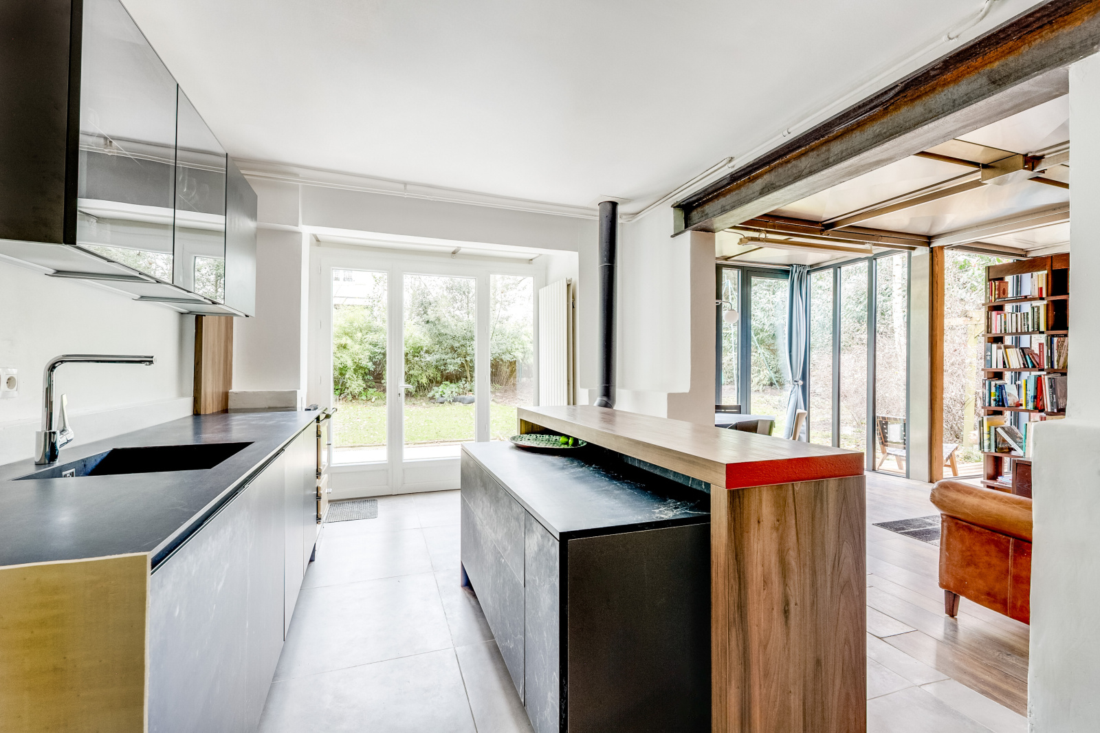 Le niveau principal s’articule autour d’une cuisine aménagée et équipée, véritable pièce de vie centrale, ouverte sur une salle à manger et un salon baignés de lumière, l’ensemble donnant de plain-pied sur un jardin exposé plein sud.