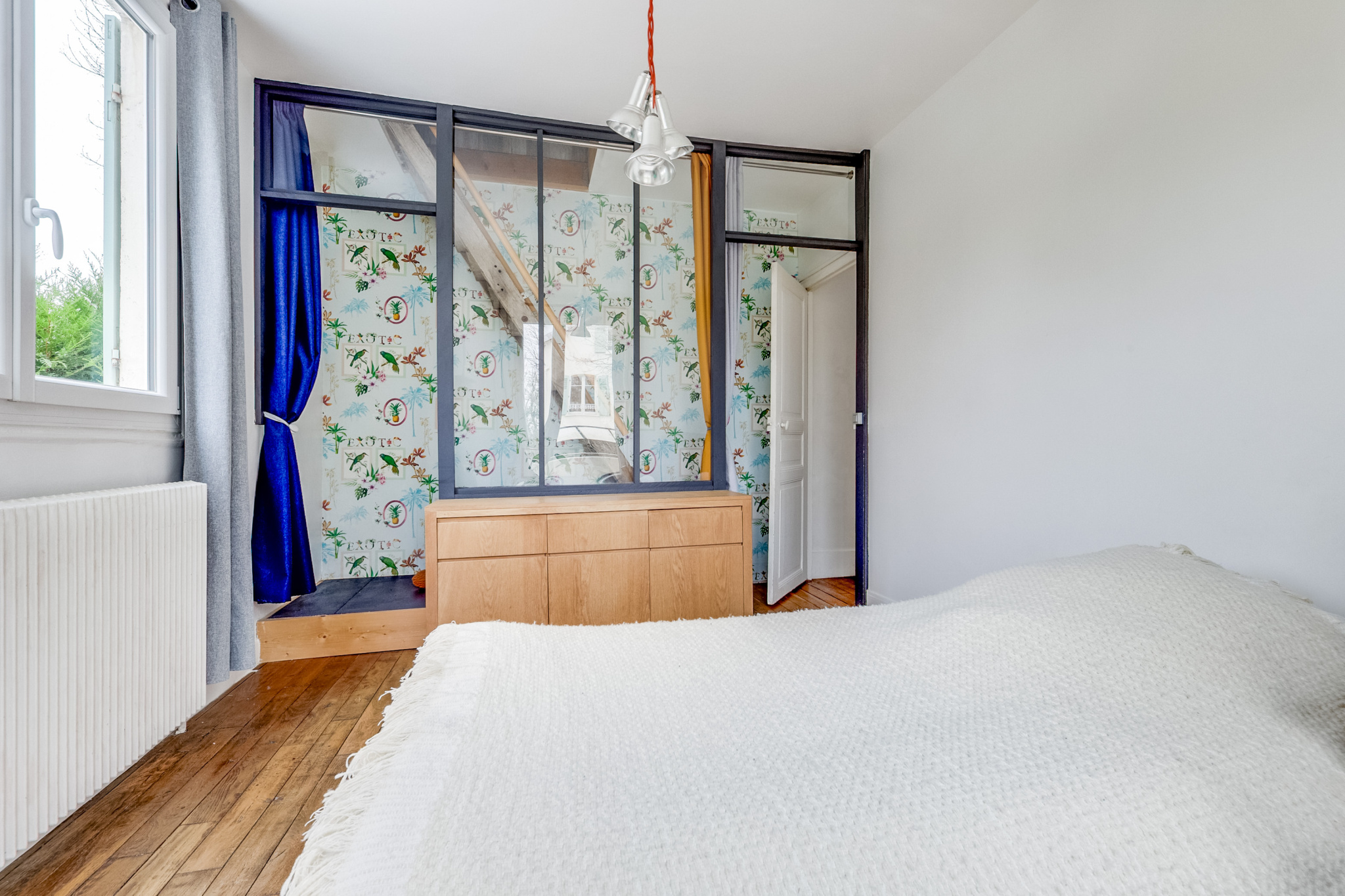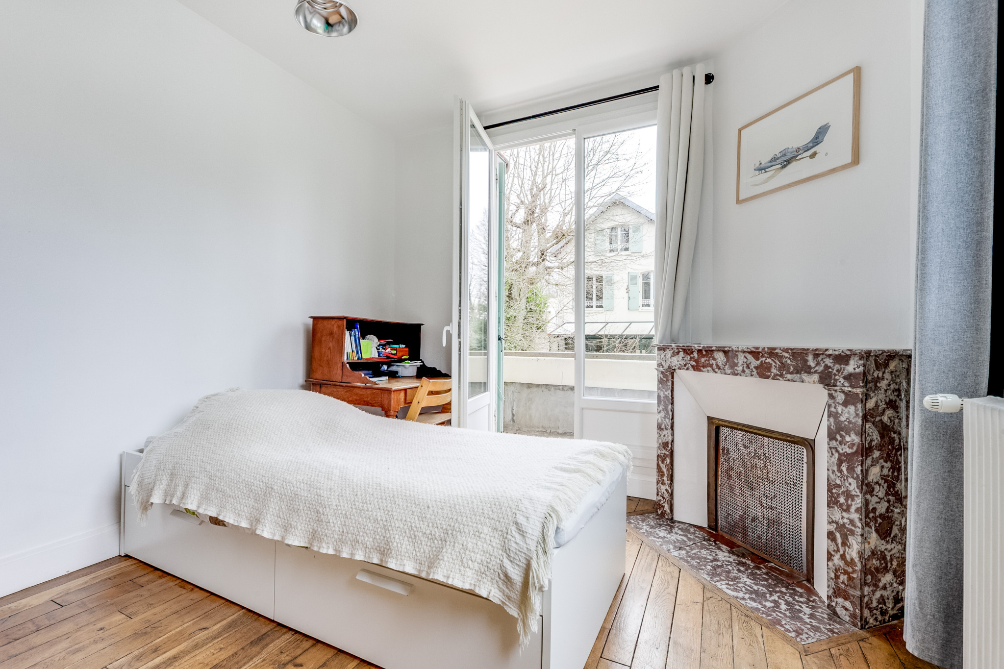 À l’étage, un premier espace comprend un dressing, une salle de bains ainsi qu’un bureau fermé pouvant facilement faire office de chambre supplémentaire. Vous y trouverez également une grande chambre avec balcon et cheminée, une seconde chambre de belles dimensions, ainsi qu’un WC indépendant.