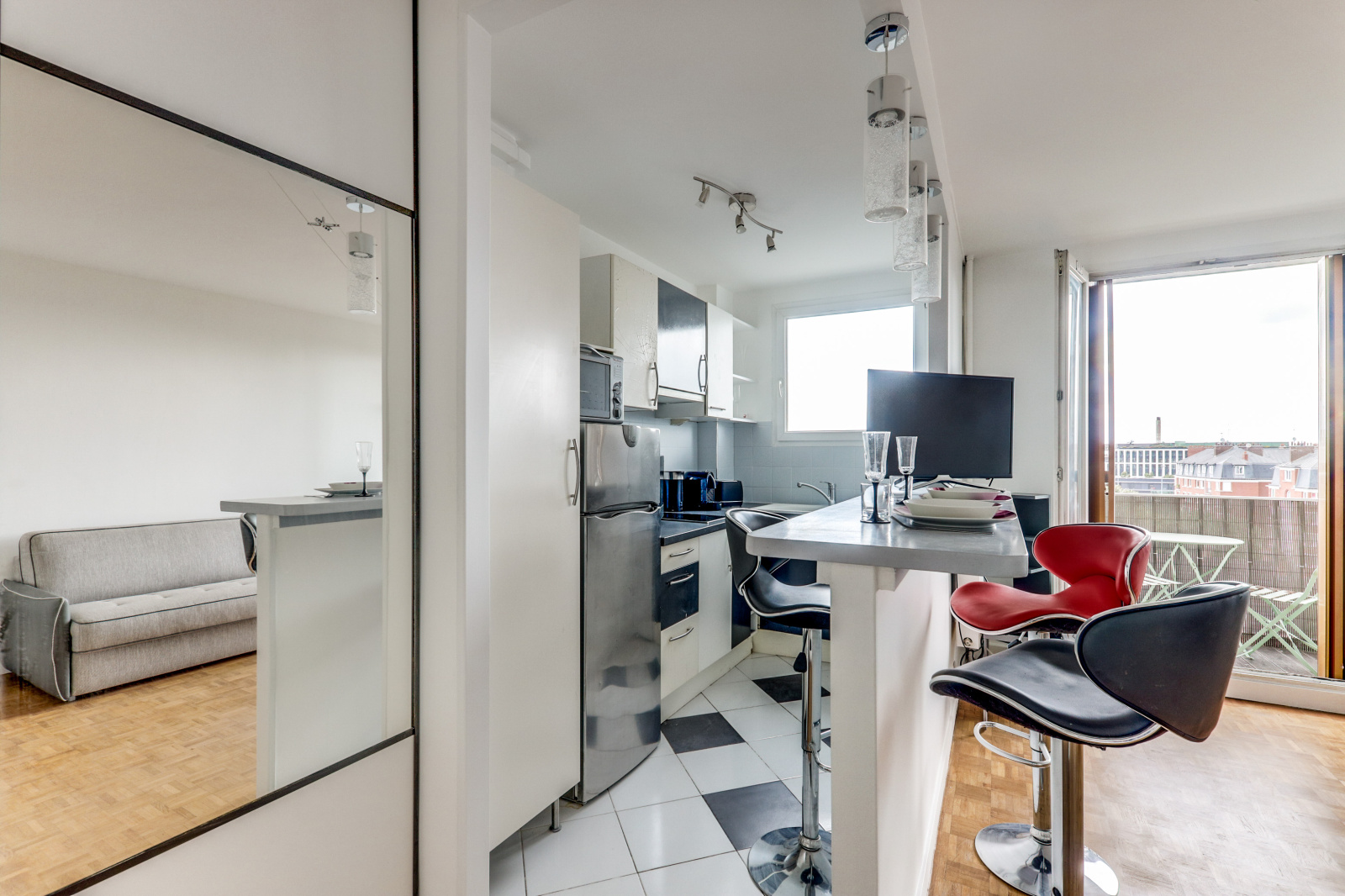 Ce logement offre une chambre avec lit double, une salle de bain, une cuisine équipée ouverte sur un salon, ainsi qu'un balcon offrant une vue dégagée sur la ville. Le canapé lit apporte un couchage supplémentaire, ce qui permet à l'appartement d'accueillir 3 personnes confortablement.
