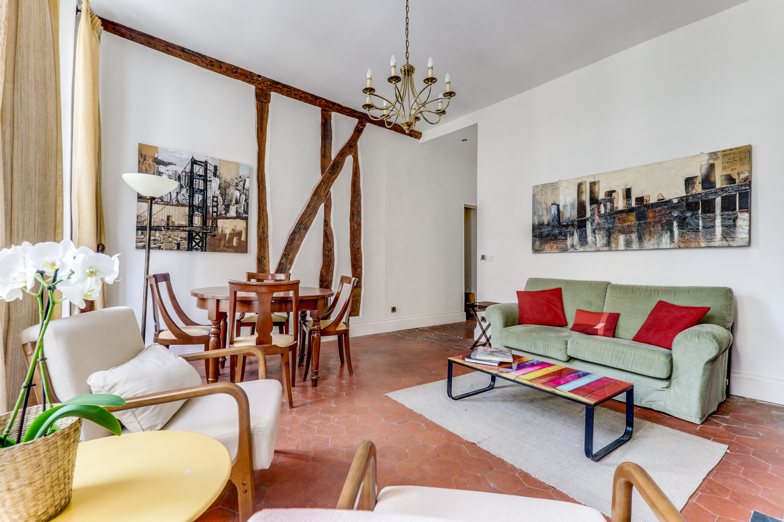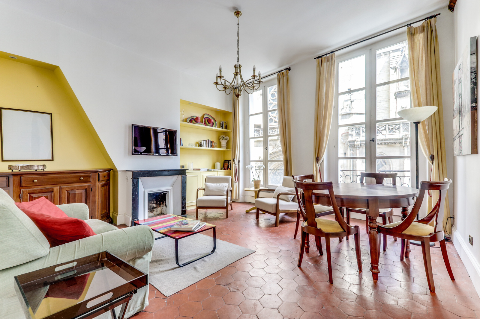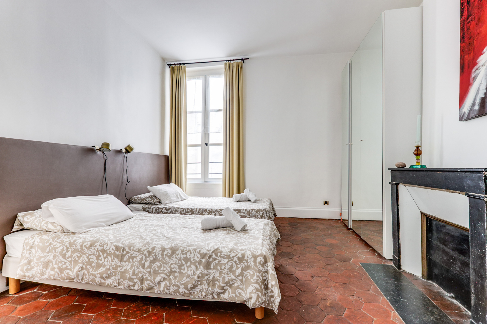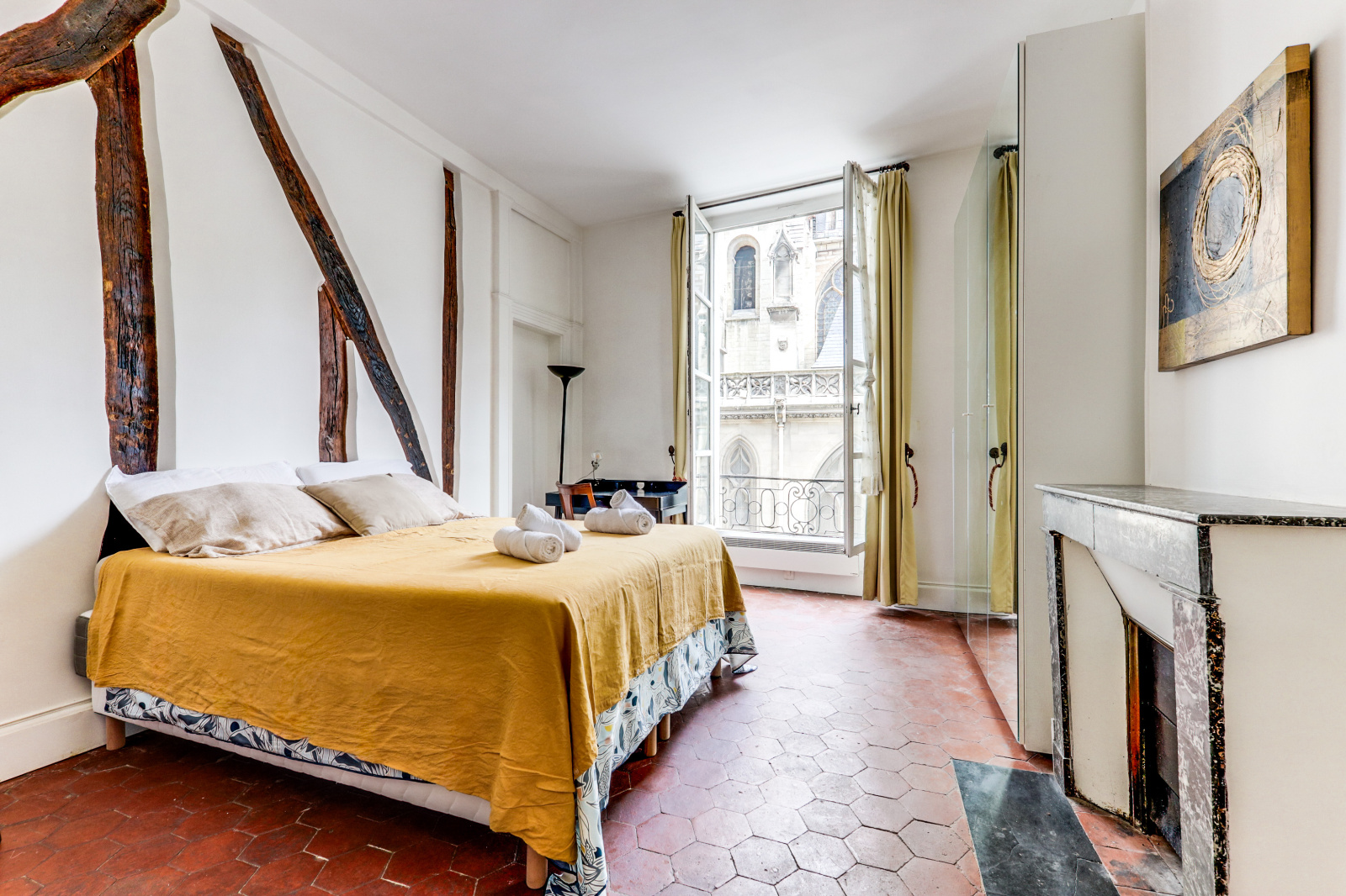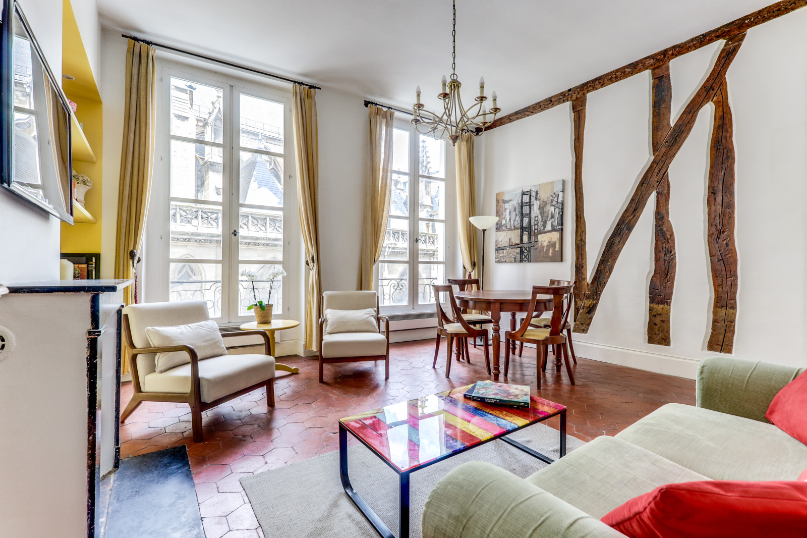 Notre appartement dispose de deux chambres spacieuses, idéales pour accueillir jusqu'à quatre personnes. Une chambre est équipée de deux lits simples avec une salle de douche, tandis que l'autre offre un lit double. La cuisine est entièrement équipée avec électroménagers, et le séjour offre de grandes fenêtres qui éclairent l'appartement de lumière naturelle vue sur l'église Saint Germain l'Auxerrois.