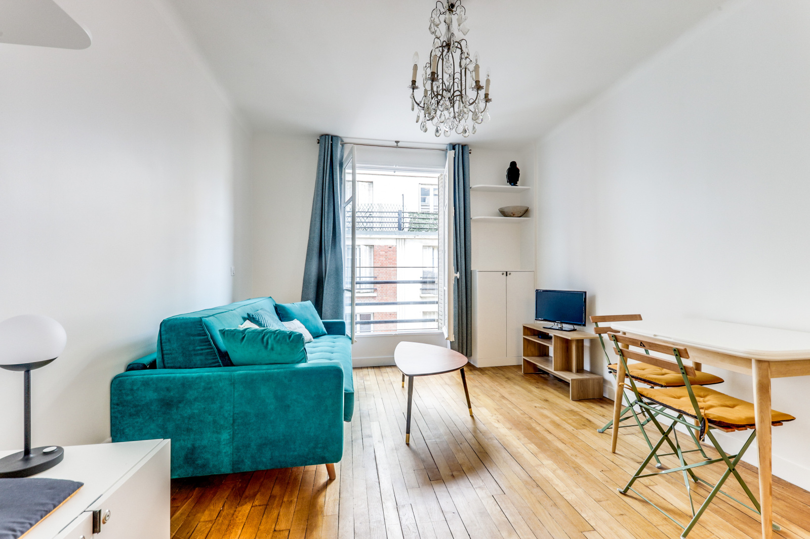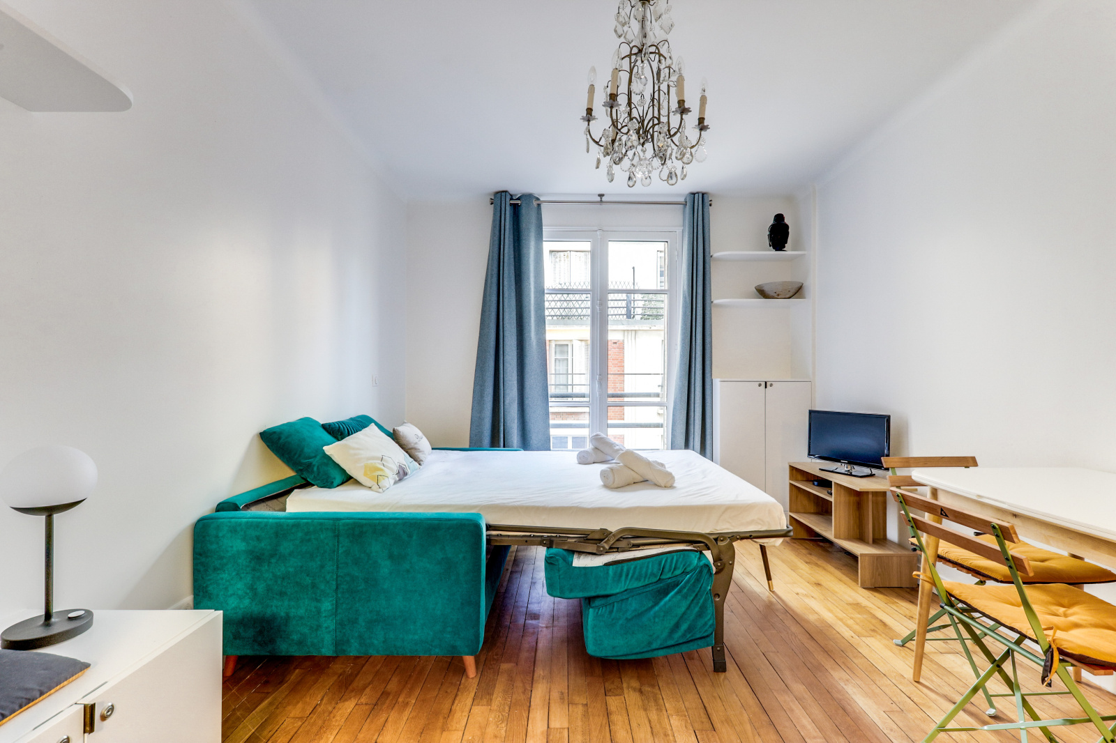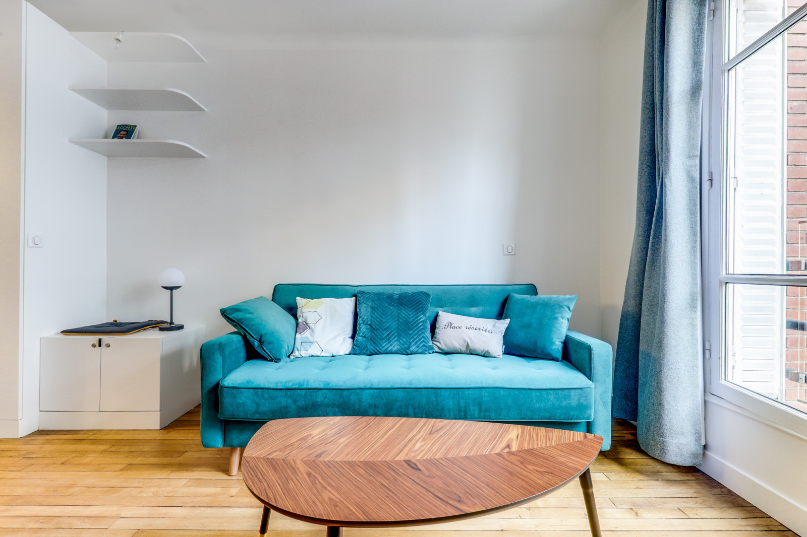 D'un séjour lumineux équipé d'un canapé convertible et d'espace de rangement.