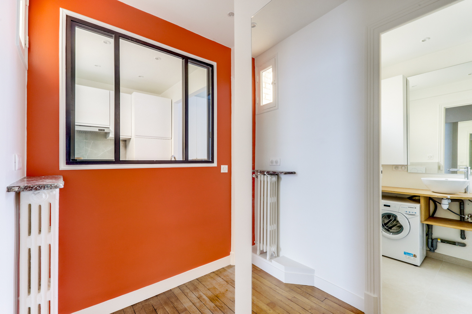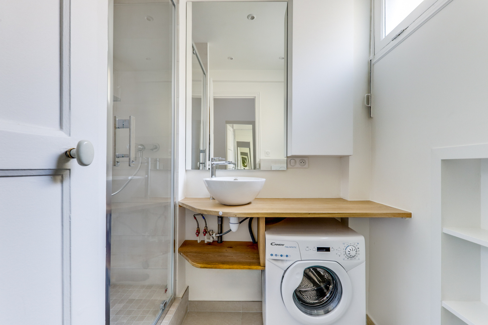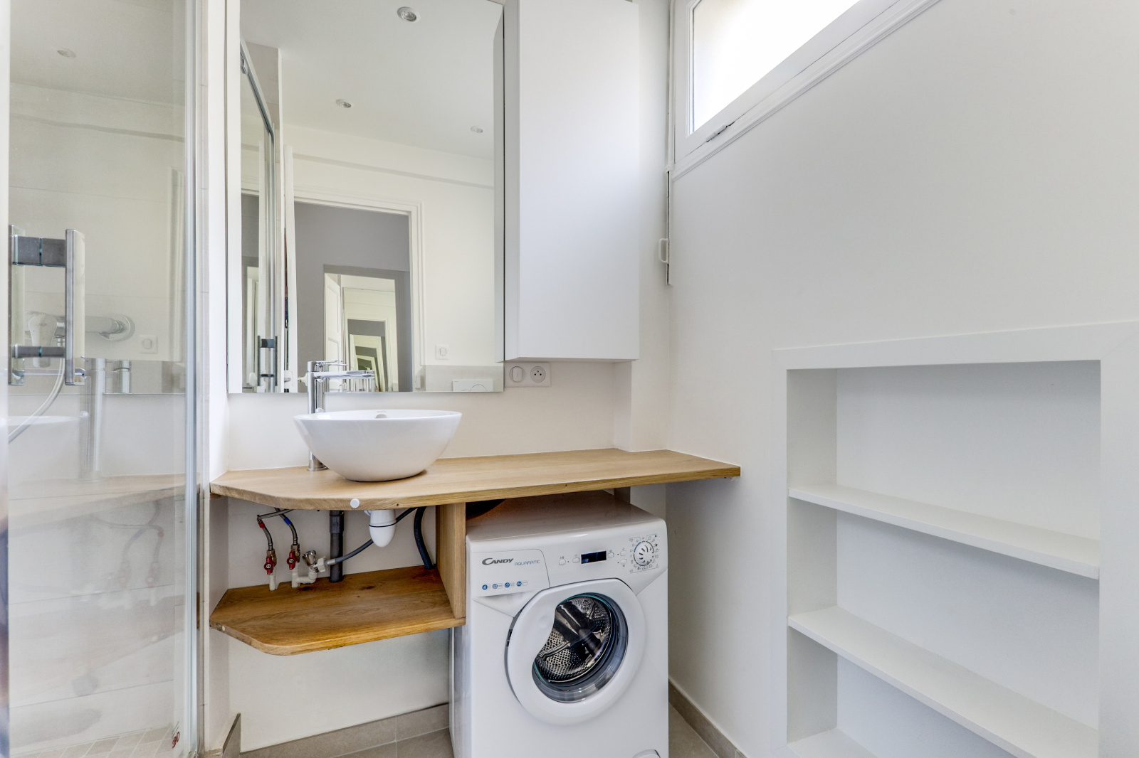 D'une salle d'eau refaite à neuf comprenant une machine à laver.