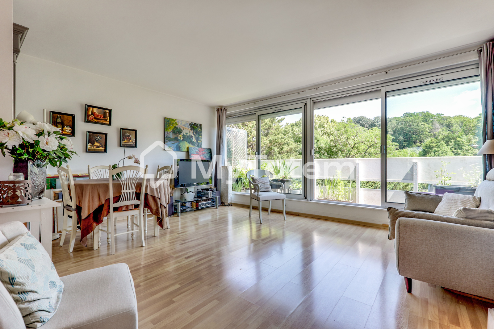 Une entrée, un séjour de 25m² lumineux orienté Sud-Ouest avec une belle vue sur la Forêt