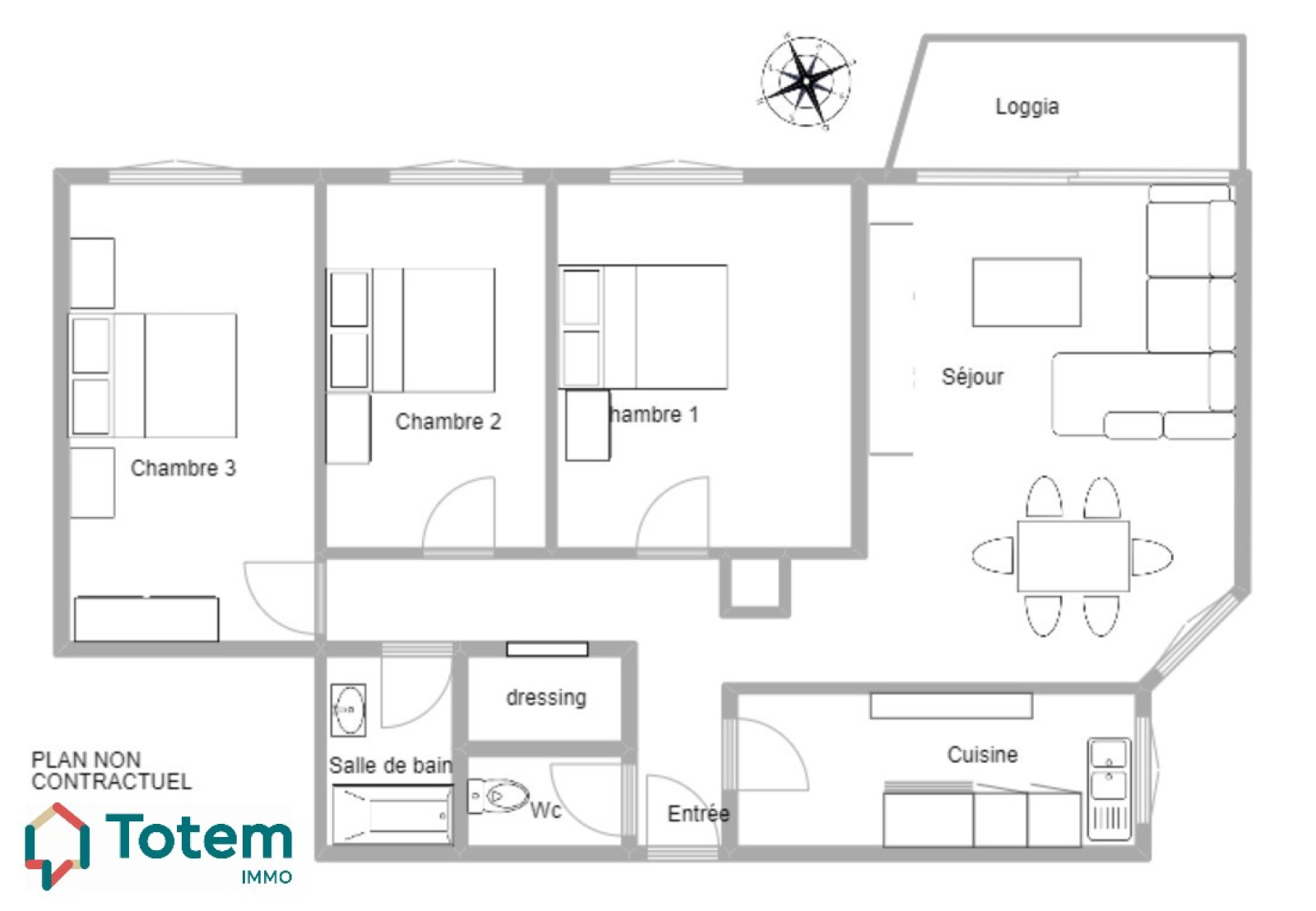 Entrée, séjour traversant avec loggia, cuisine indépendante aménagée (possible US), 3 chambres dressing,salle de bains et wc indépendant.