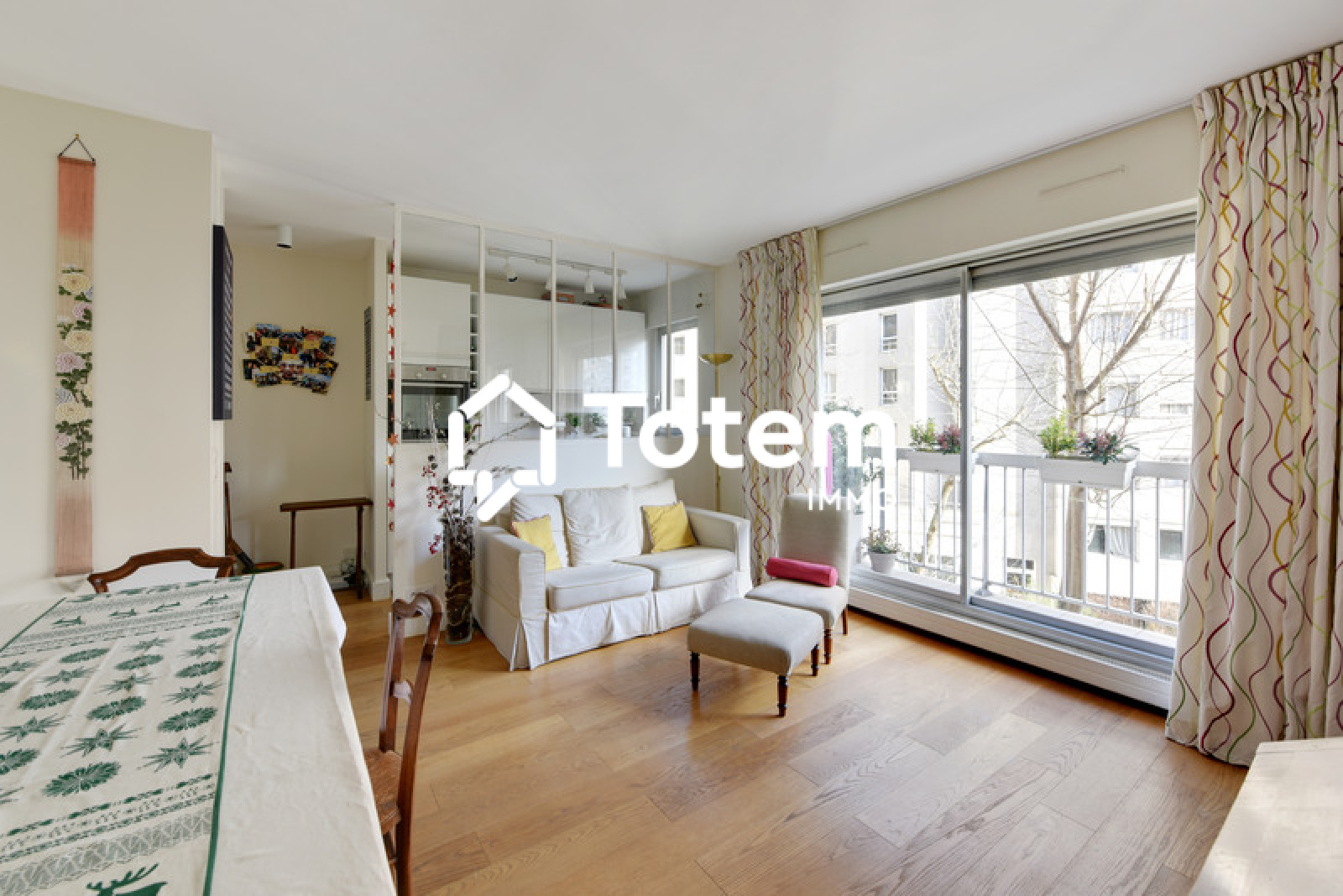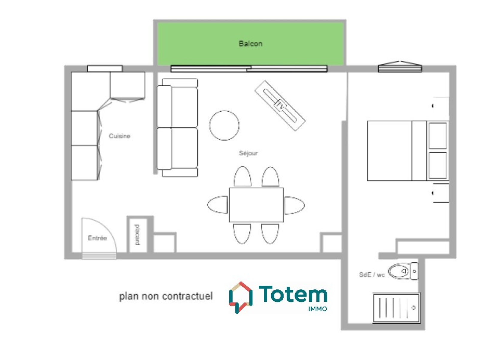 Entrée, séjour sur balcon, cuisine semi ouverte, chambre, salle de bains avec wc.