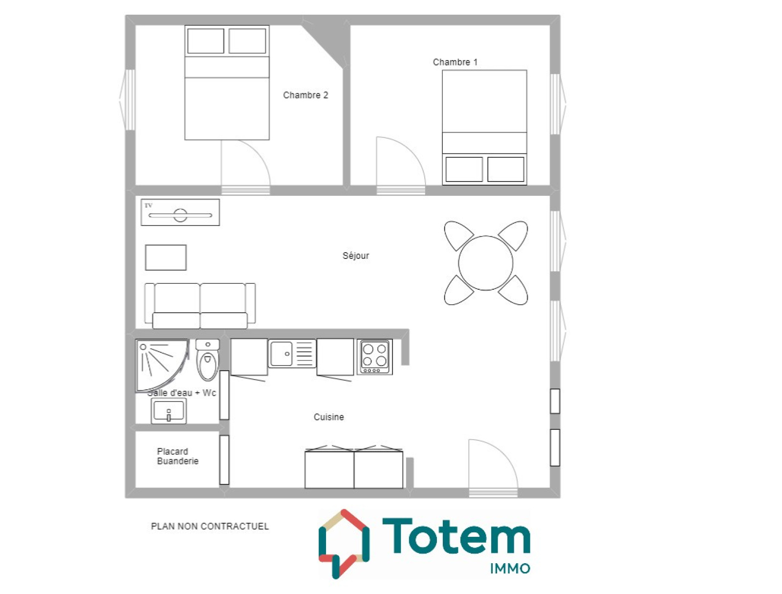 L'appartement se compose d'une entrée, un séjour, une cuisine aménagée et équipée, deux chambres, une salle d'eau avec wc.