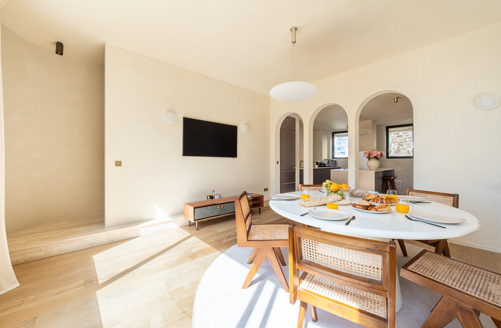 Une salle à manger ouverte sur une cuisine sur-mesure entièrement équipée,