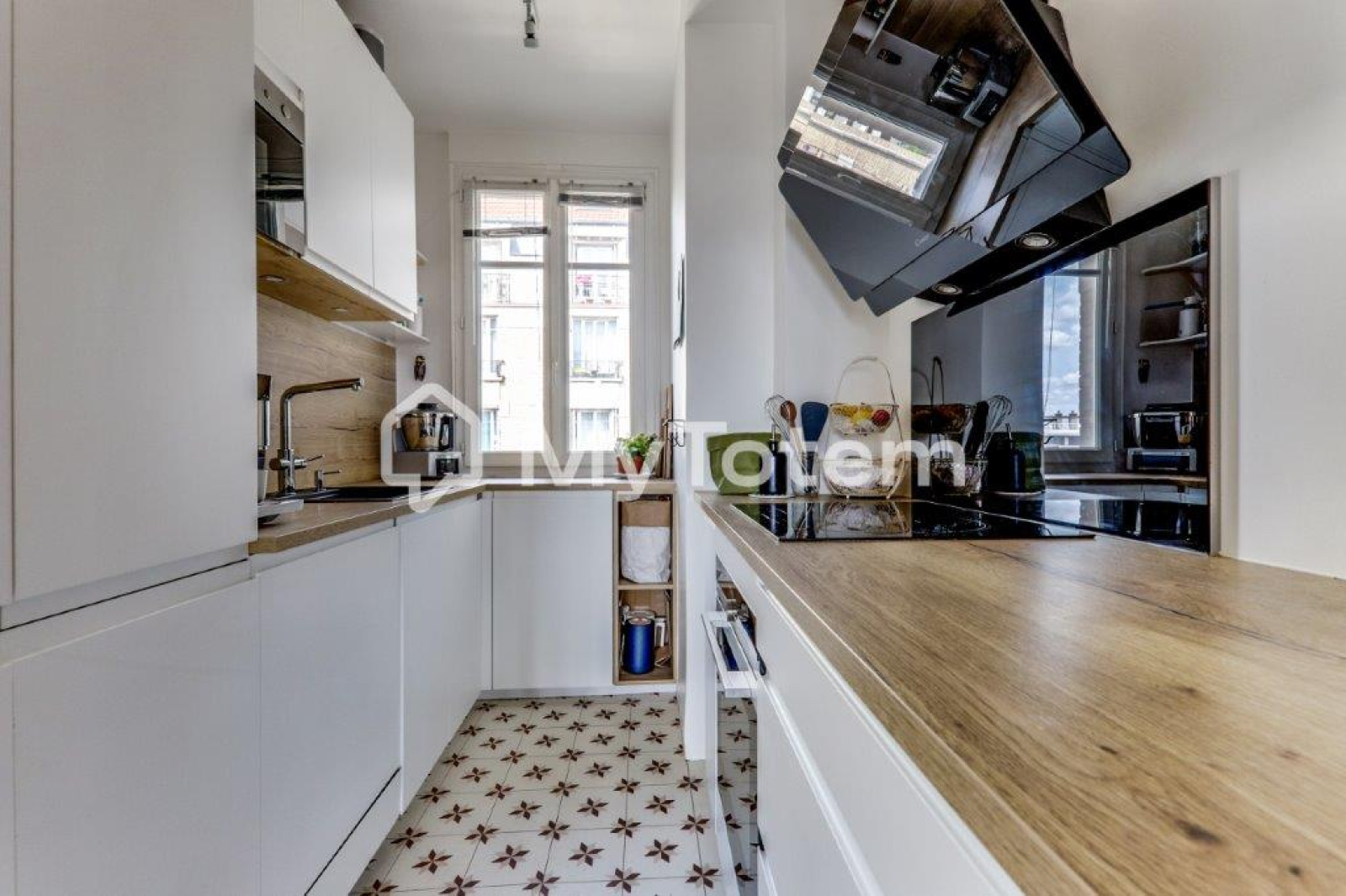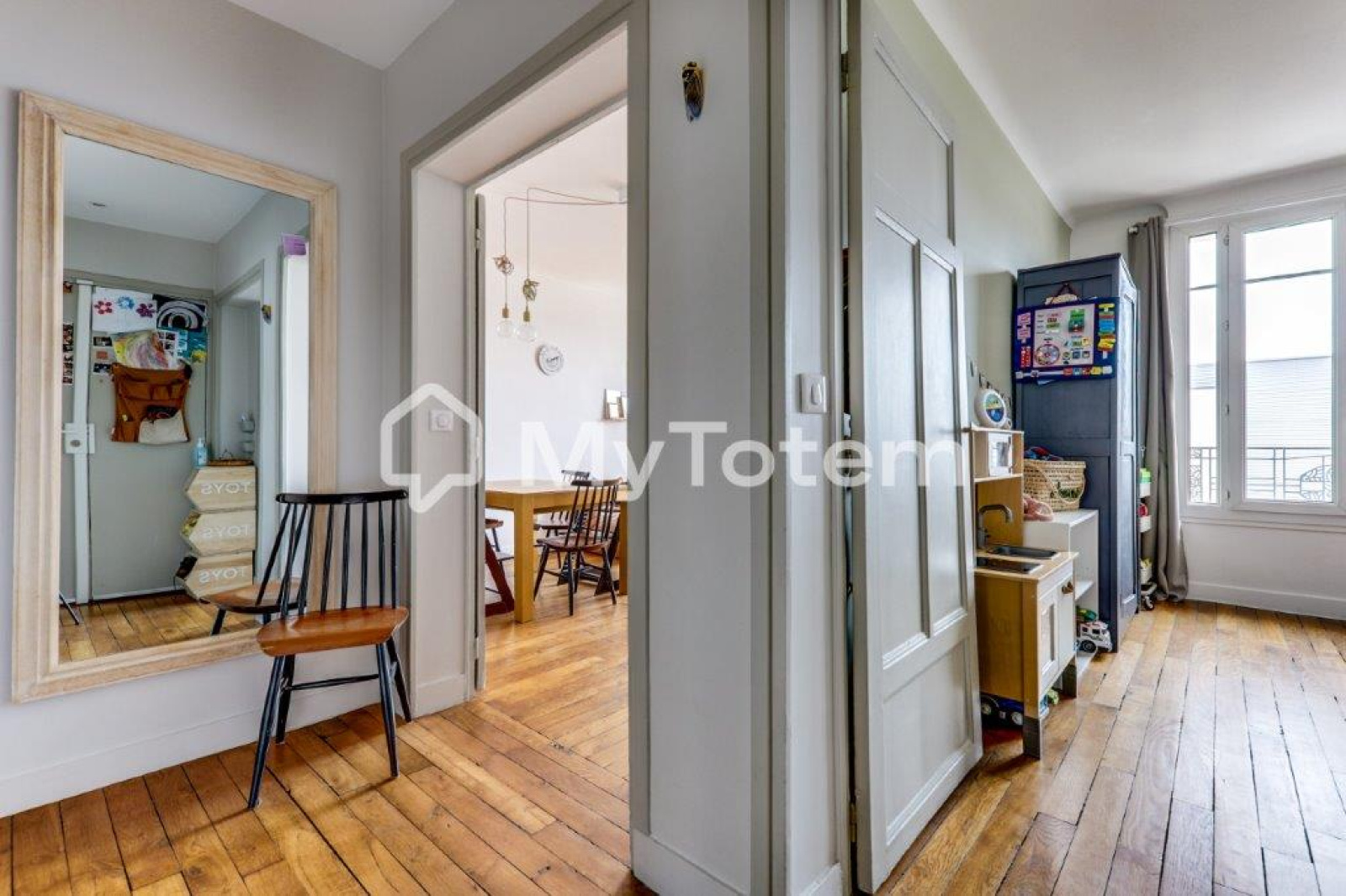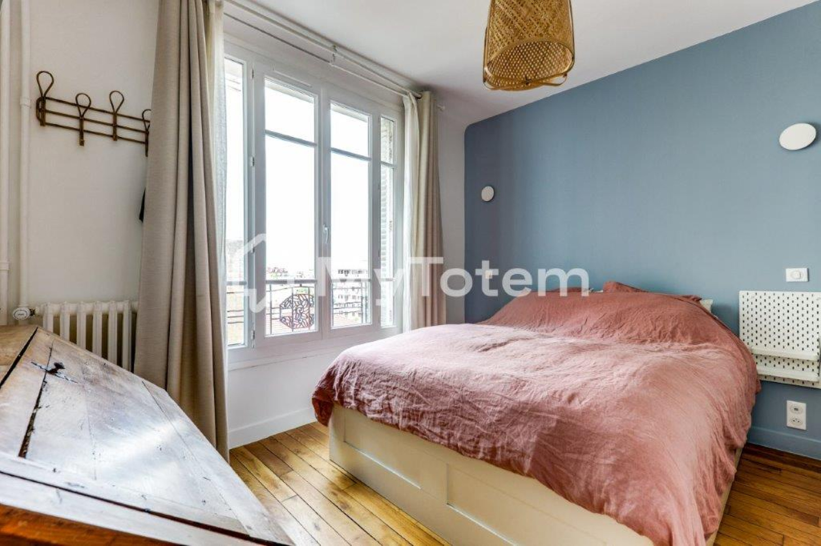 Entrée, séjour exposé sud sans vis à vis avec vue sur la Tour Eiffel / la Défense / Sacré-Coeur, cuisine aménagée et équipée, 2 chambres, 1 bureau, salle de bains et cave.