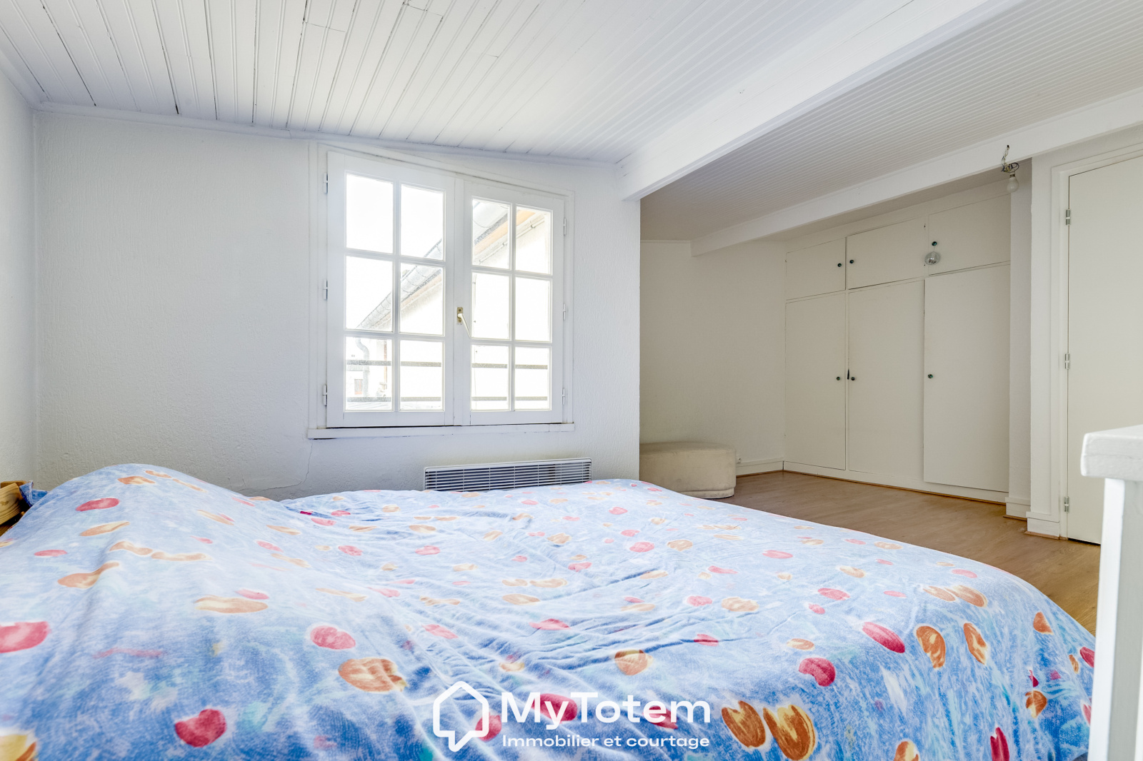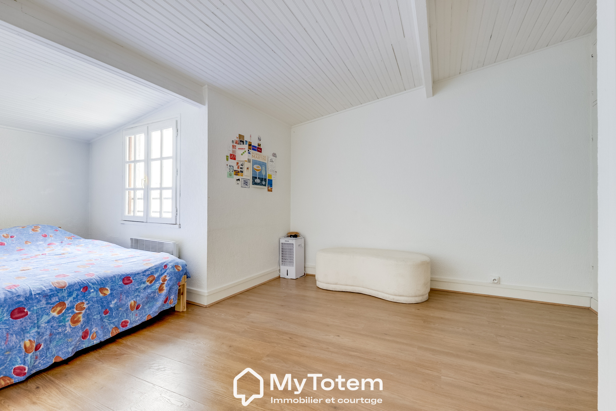 À l’étage supérieur, une grande chambre lumineuse offre un véritable espace nuit confortable, complété par de nombreux rangements intégrés, permettant une organisation optimale.