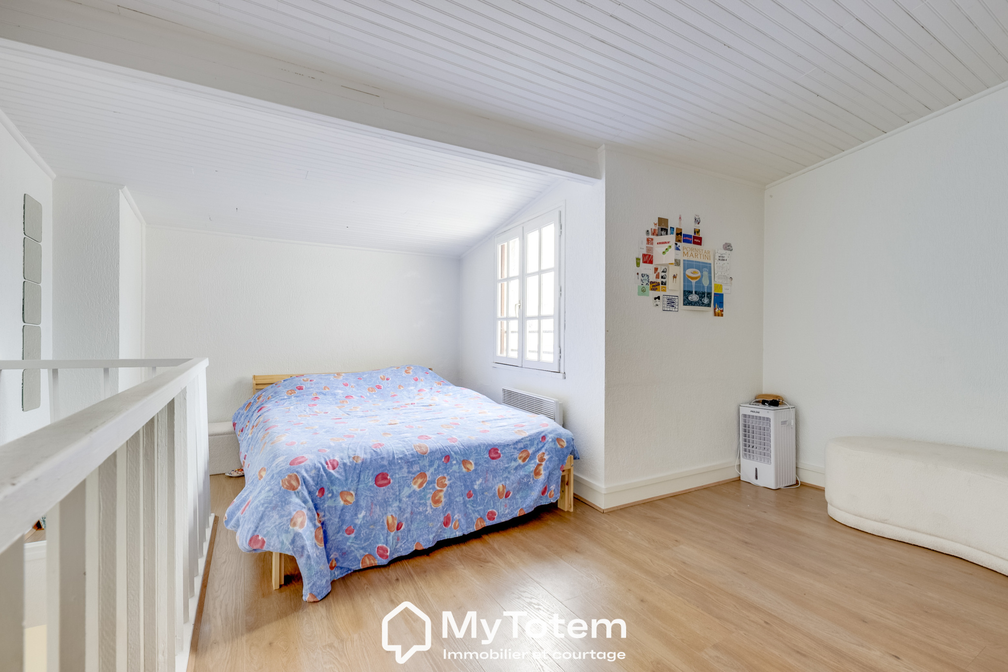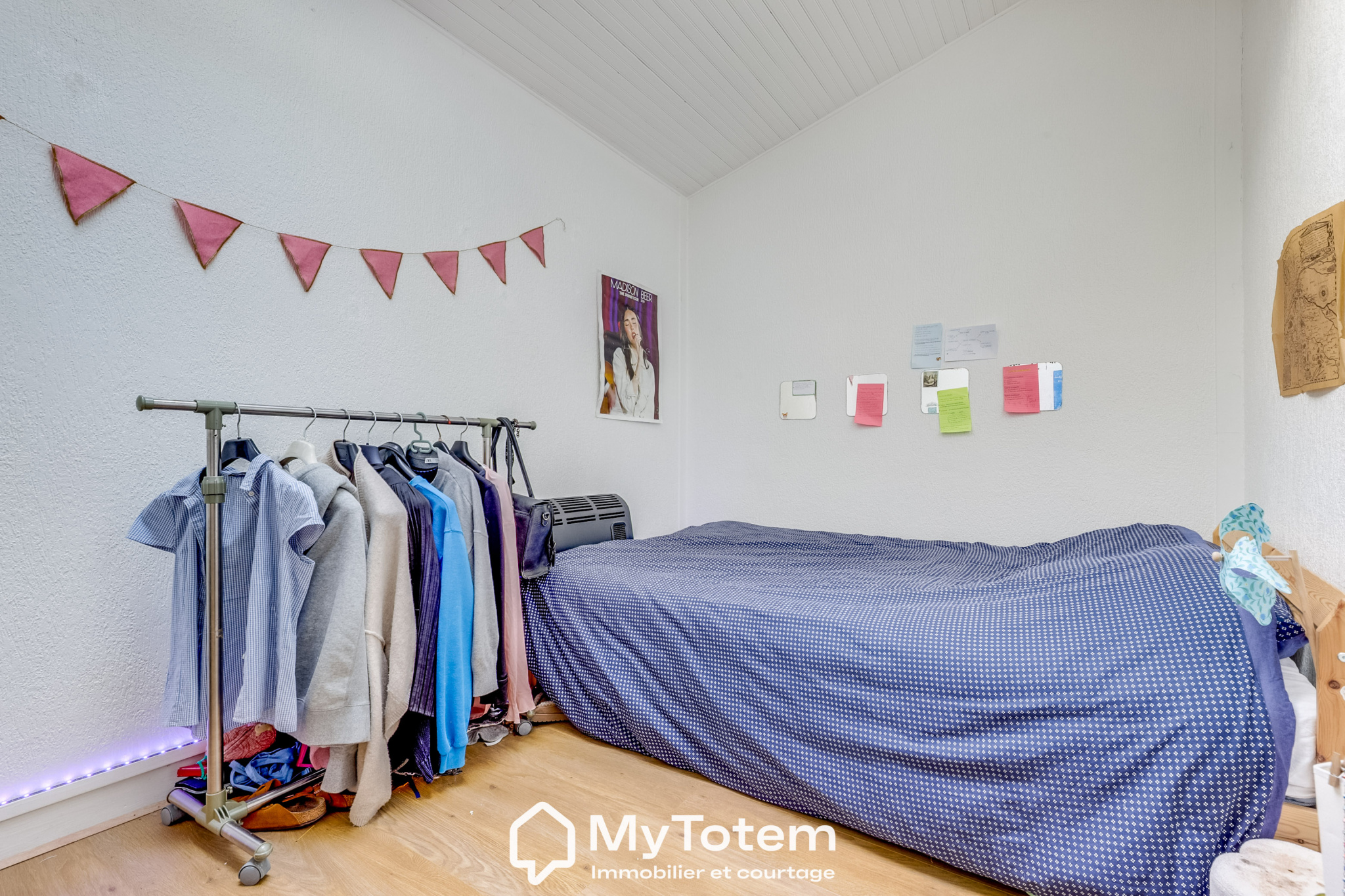 À l’étage supérieur, une grande chambre lumineuse offre un véritable espace nuit confortable, complété par de nombreux rangements intégrés, permettant une organisation optimale.