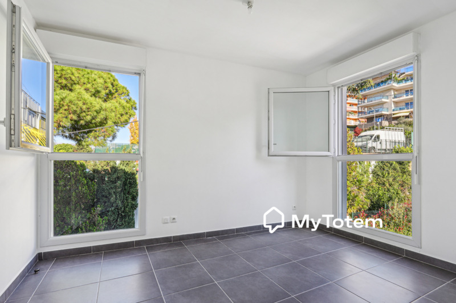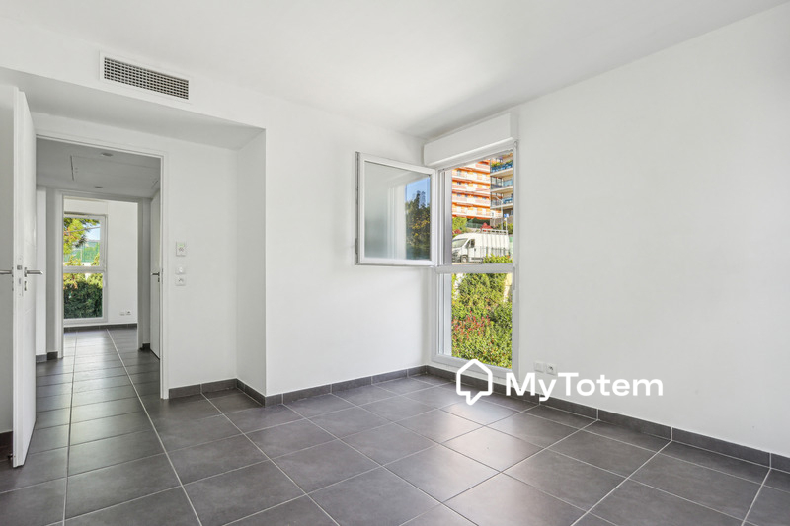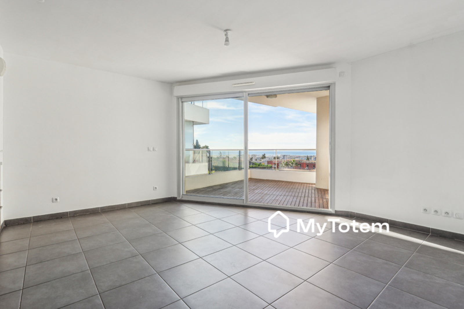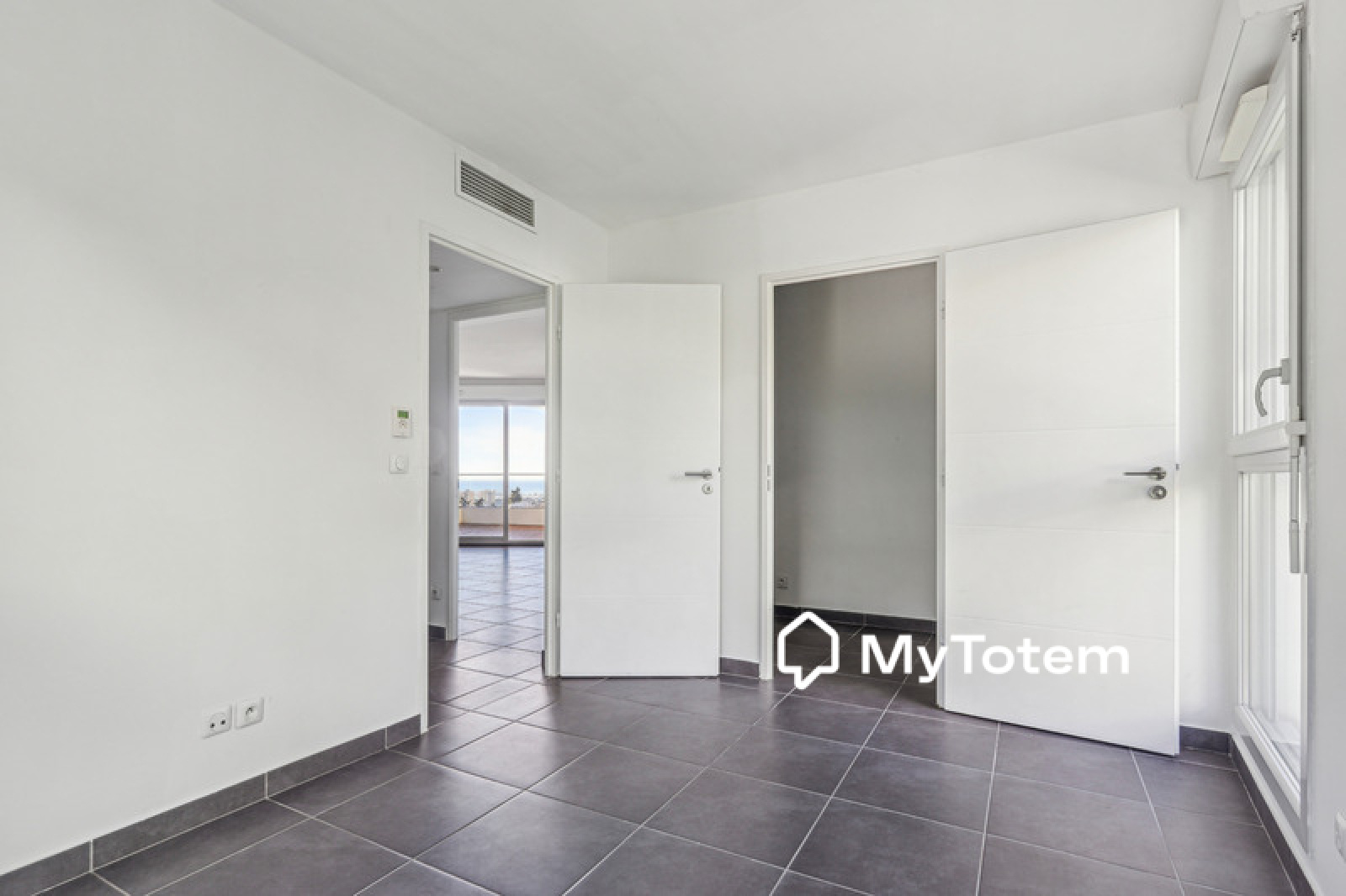 Lumineux et bien distribué, il offre un séjour avec cuisine ouverte donnant sur une terrasse avec vue dégagée sur la mer, les collines et le cap d'Antibes, deux chambres dont une avec dressing/buanderie, une salle de bain et un WC séparé. Un box fermé au sous-sol du batiment est possible à l'achat pour 25.000€.