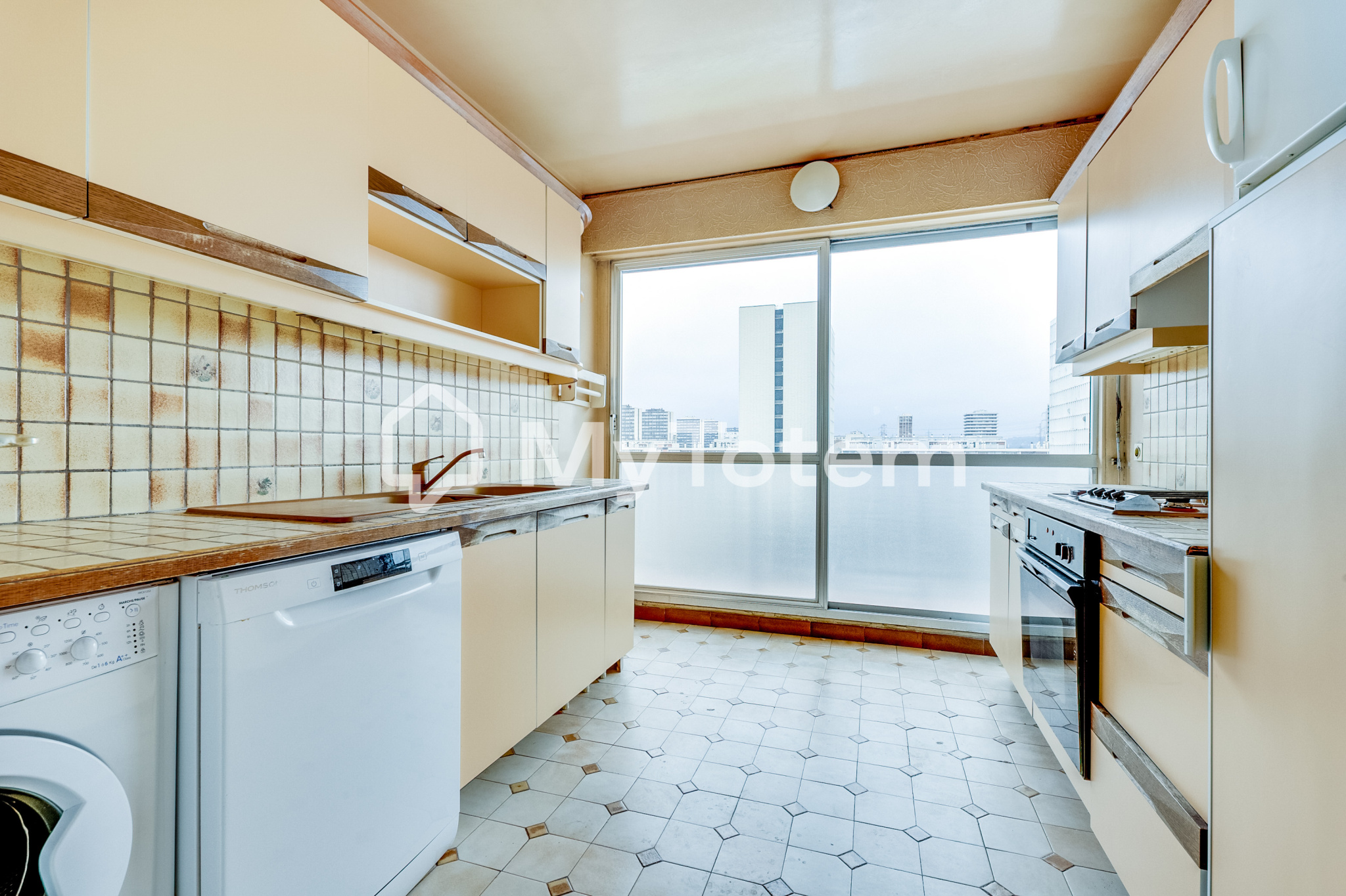 Au dernier étage d'un immeuble avec ascenseur, appartement 6 pièces de 100m² (98,91m² carrez) distribué comme suit : entrée avec placard, séjour double, salle à manger, cuisine aménagée, 3 ou 4 chambres, salle de bains avec WC, salle d'eau, WC, divers rangements et balcons.